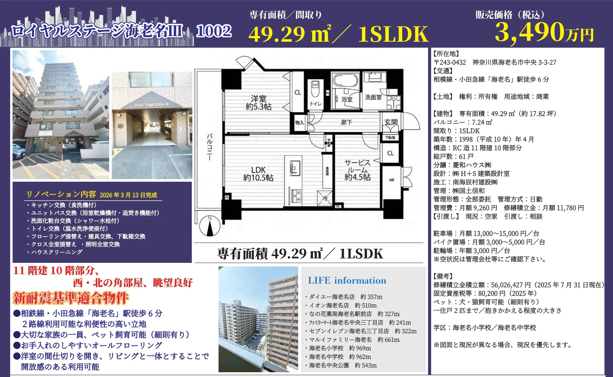 | 物件名 | ロイヤルステージ海老名Ⅲ 1002号 |