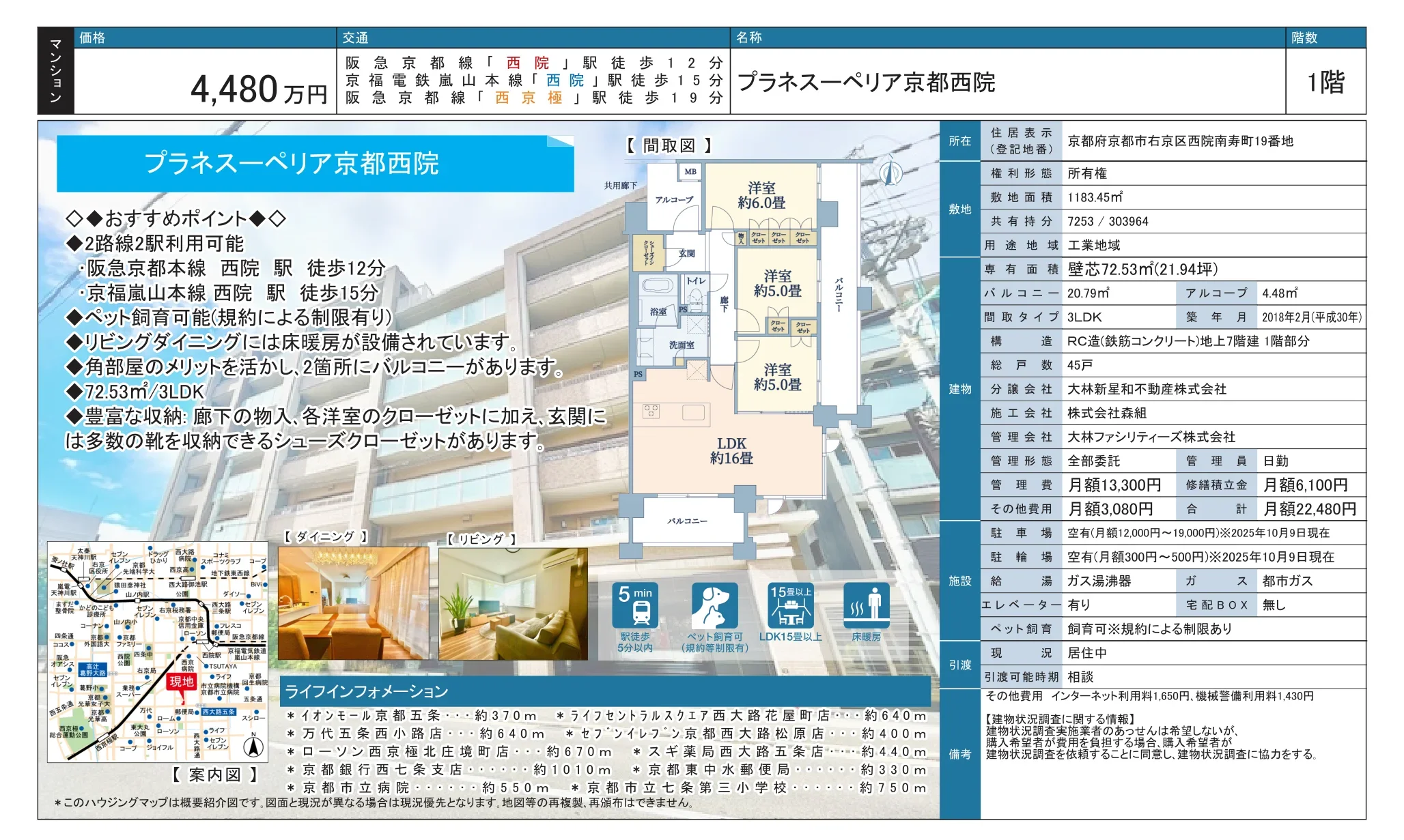 | 物件名 | プラネスーペリア京都西院 1号 |