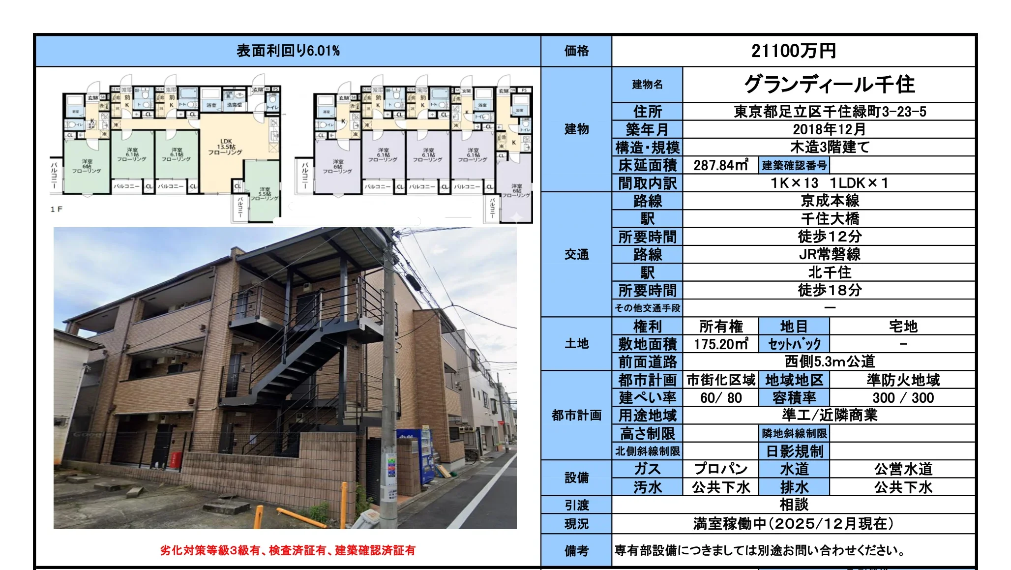 | アクセス | 千住大橋 (徒歩12分) 北千住 (徒歩18分) |