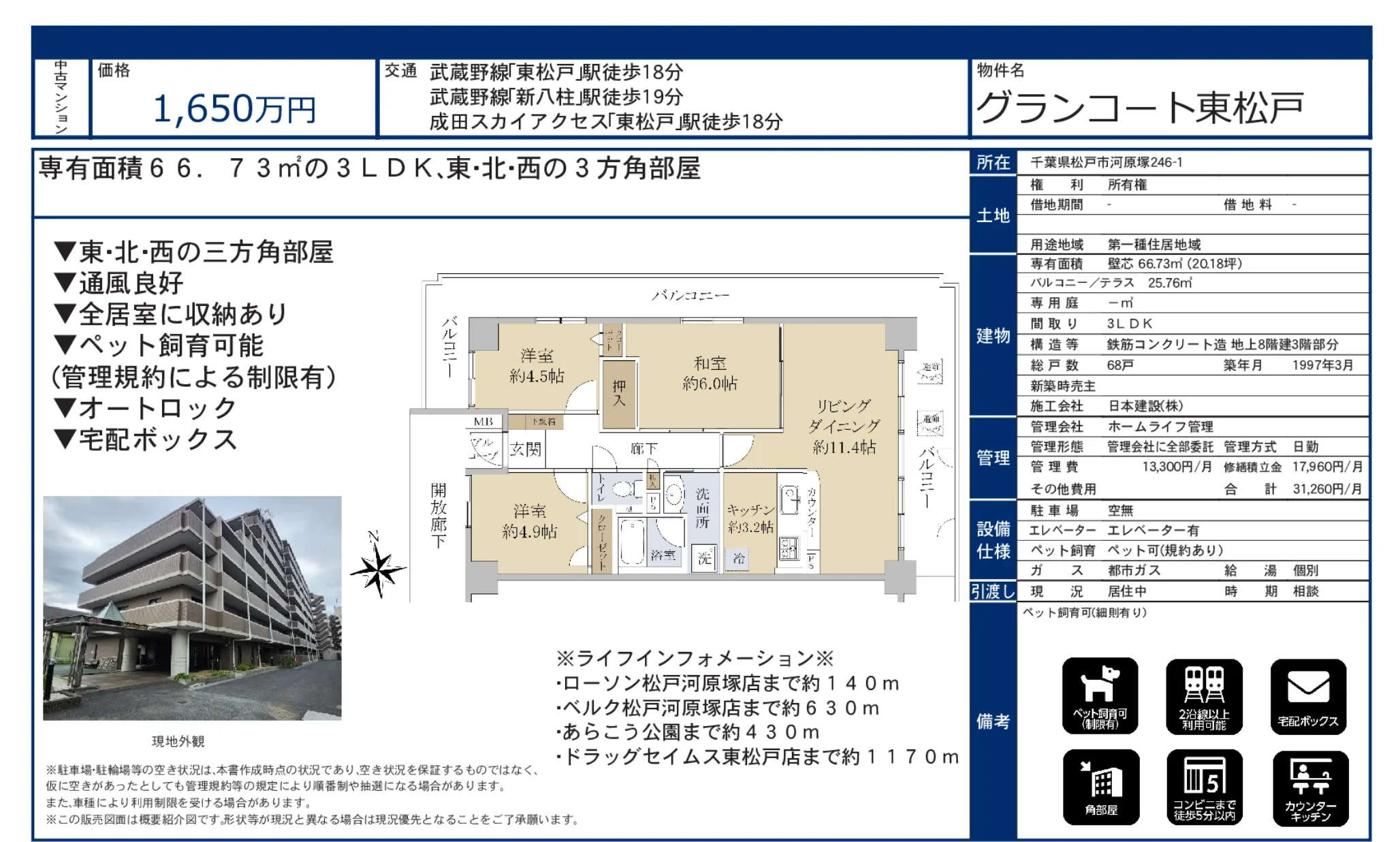 | アクセス | 東松戸駅 (徒歩18分) 新八柱駅 (徒歩19分) 東松戸駅 (徒歩18分) |