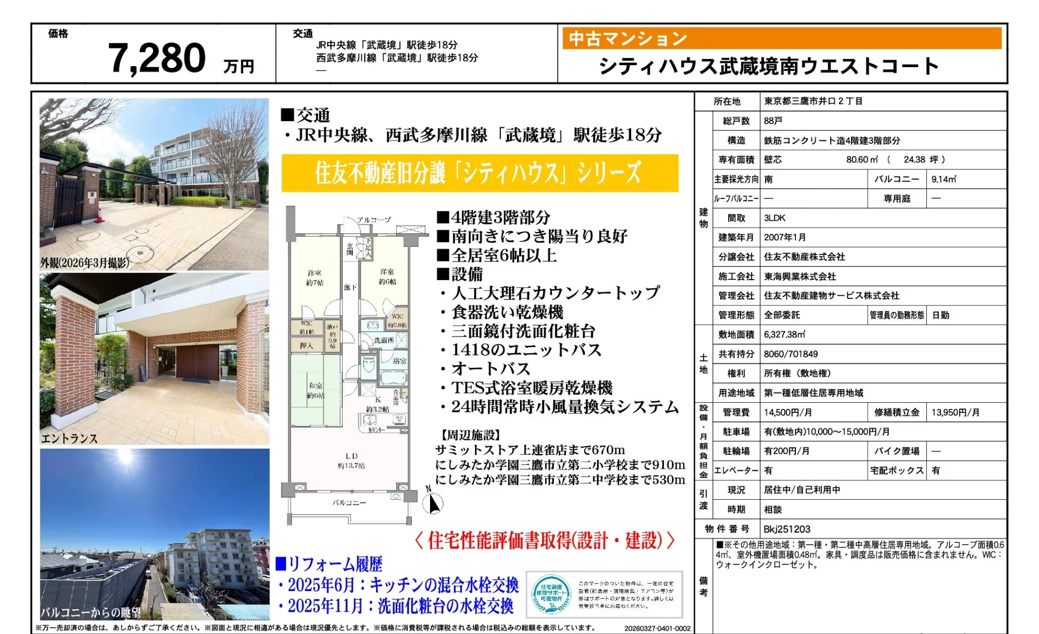 | 物件名 | シティハウス武蔵境南ウエストコート |
