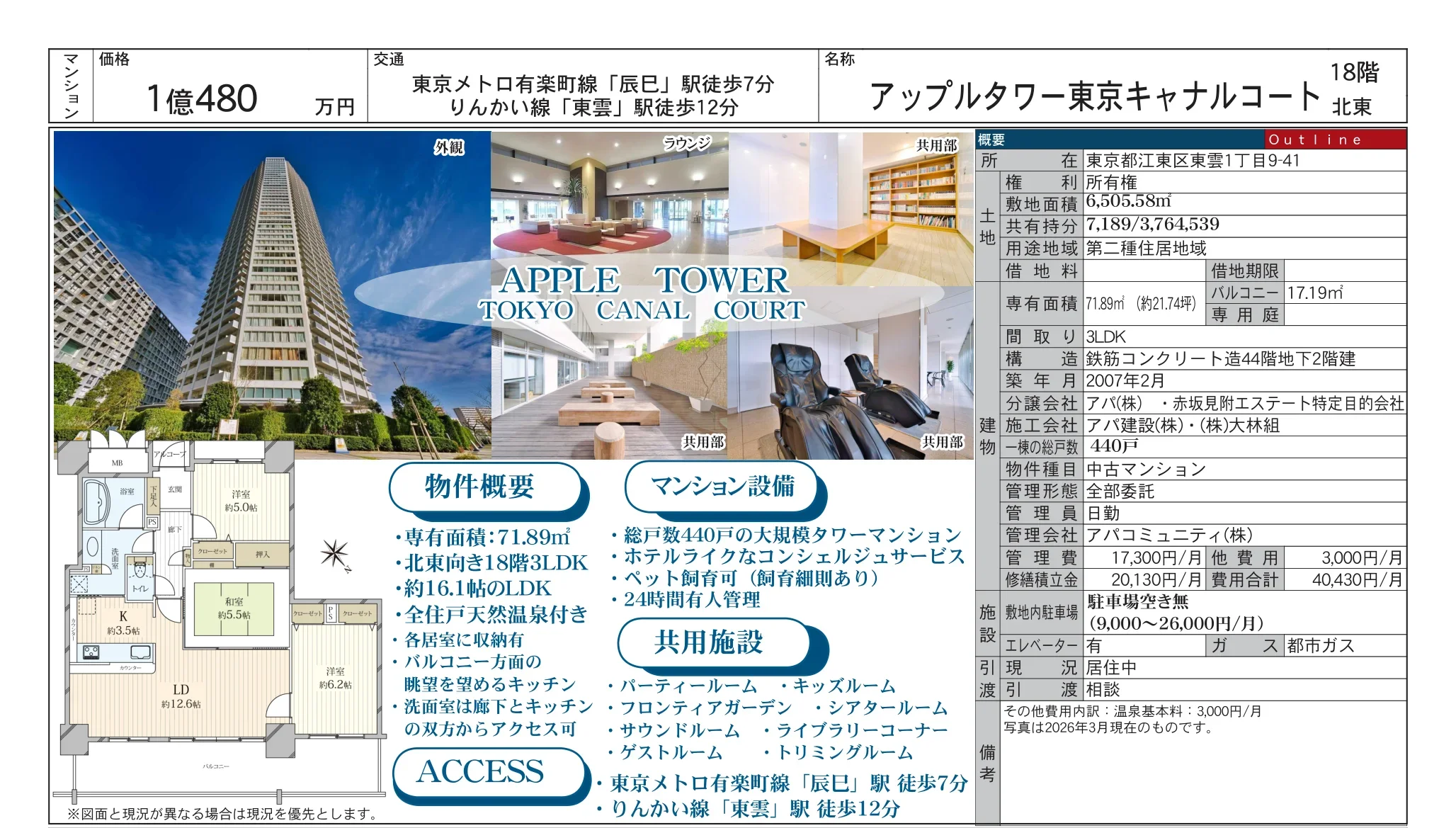 | 物件名 | アップルタワー東京キャナルコート 18号 |
