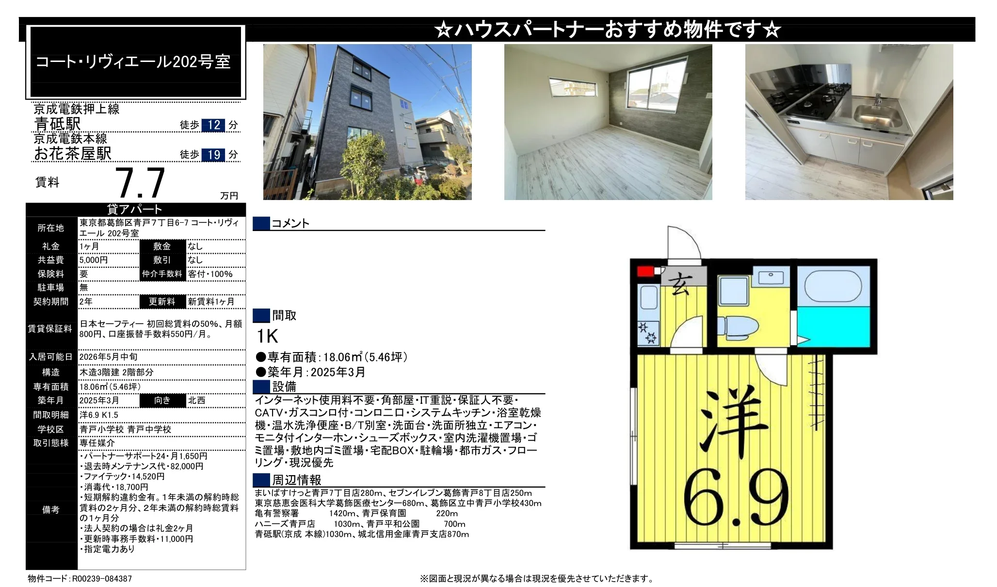 | 所在地 | 東京都葛飾区青戸7丁目6-7 コート・リヴィエール 202号室 |