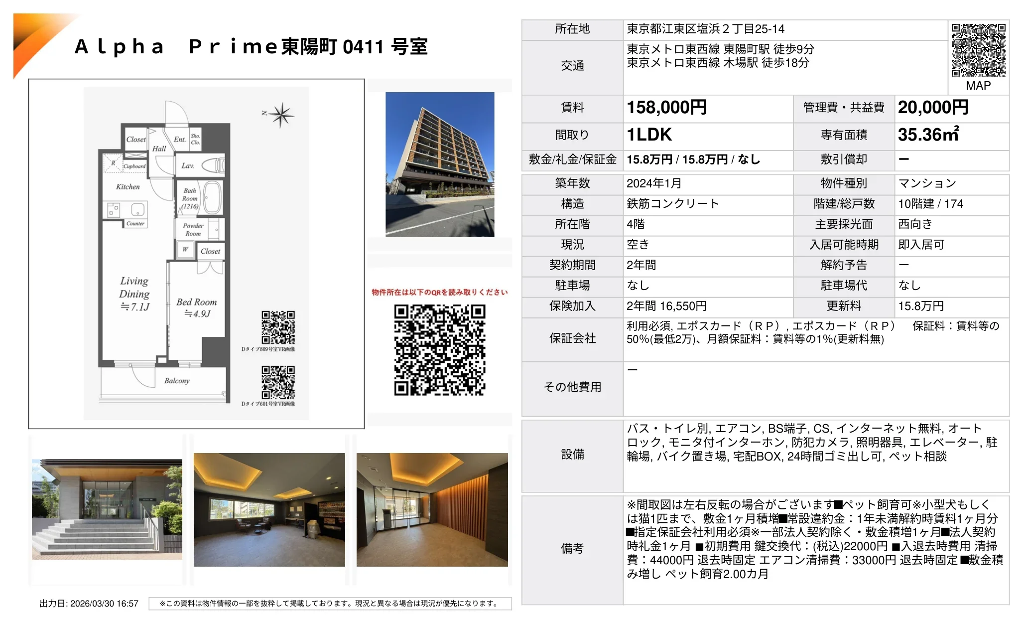 | 物件名 | アルファプライム東陽町0411号室 0411号 |