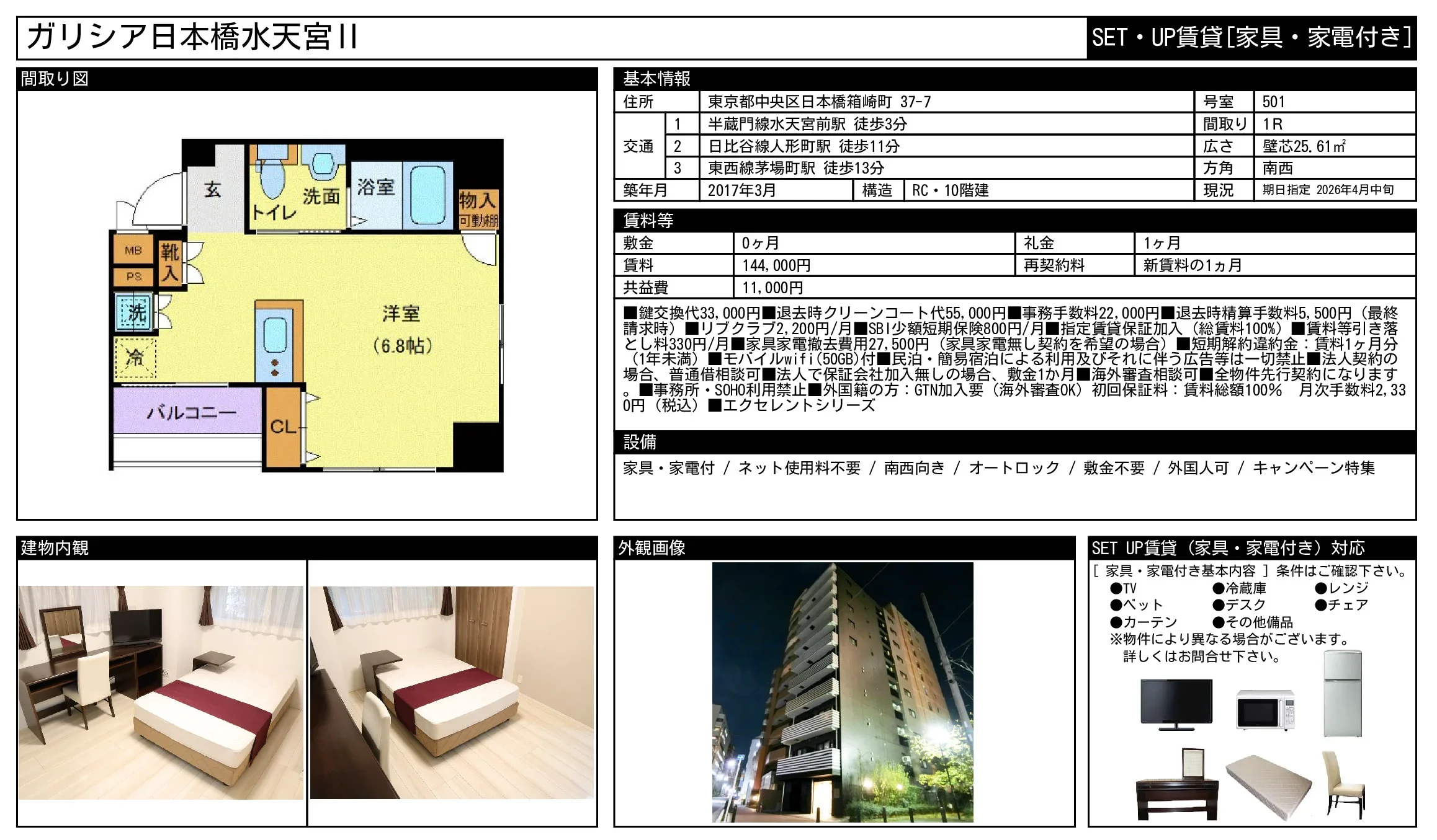 | 物件名 | ガリシア日本橋水天宮II 501号 |
