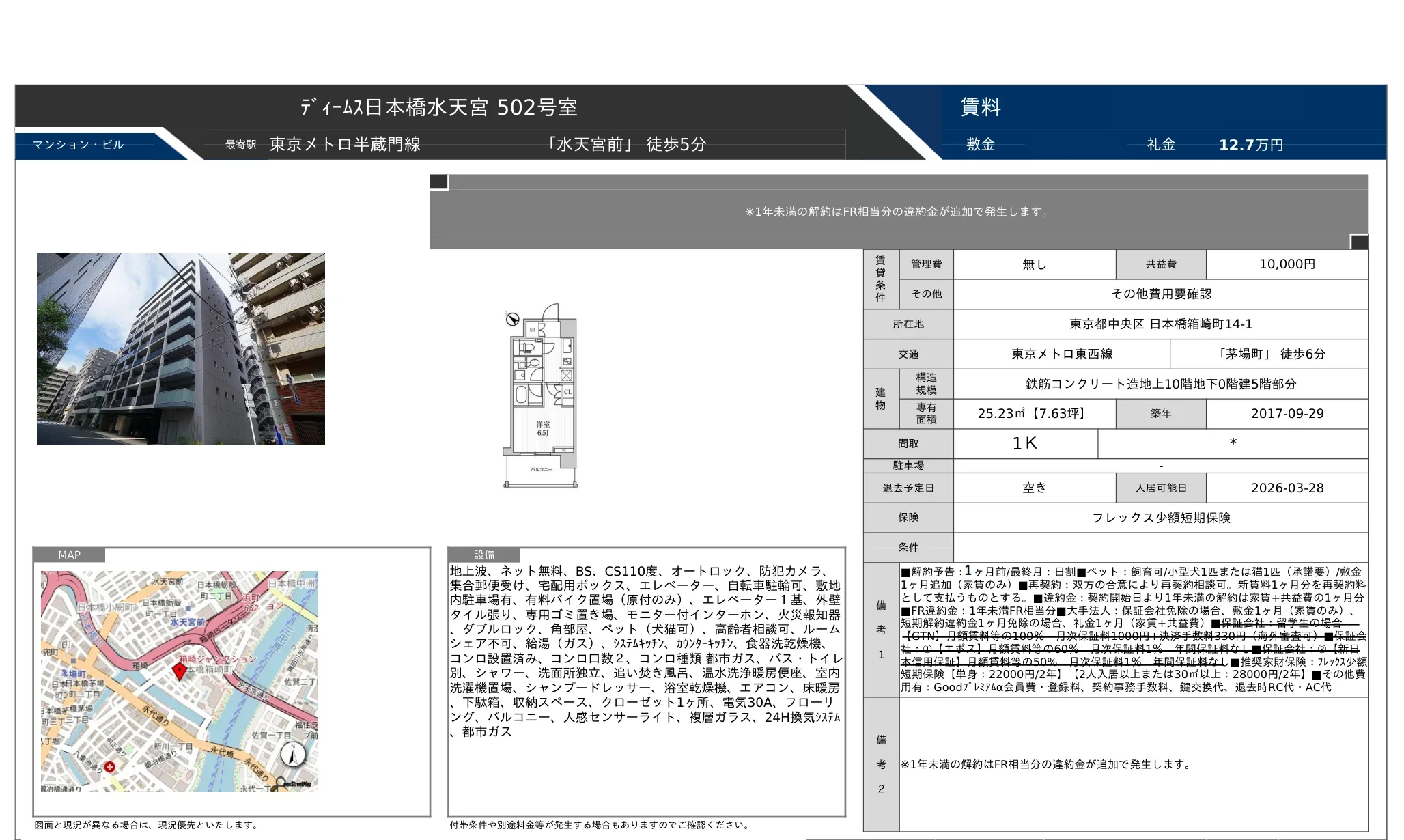 | 物件名 | ディームス日本橋水天宮 502号 |