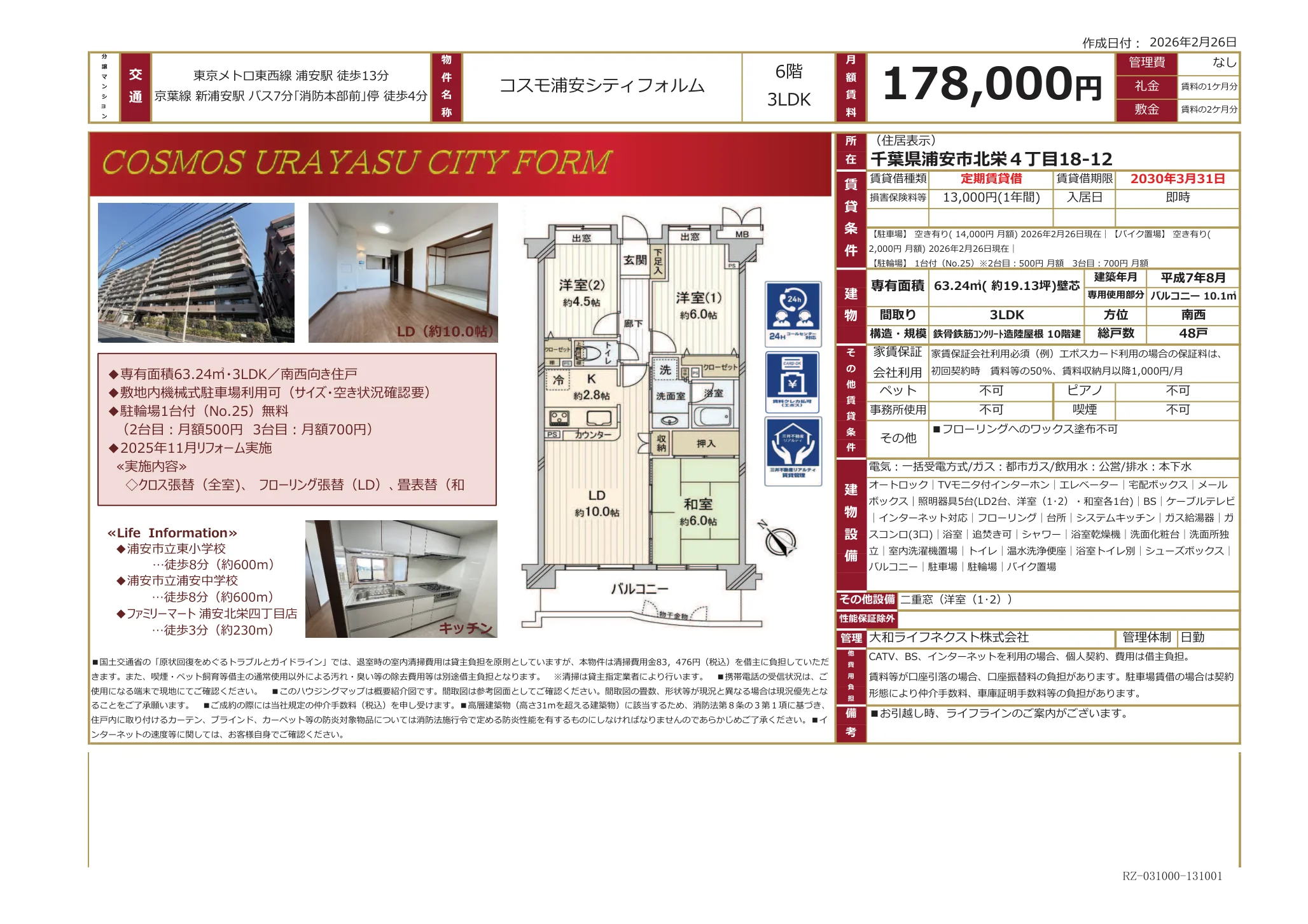 | 物件名 | コスモ浦安シティフォルム 6号 |