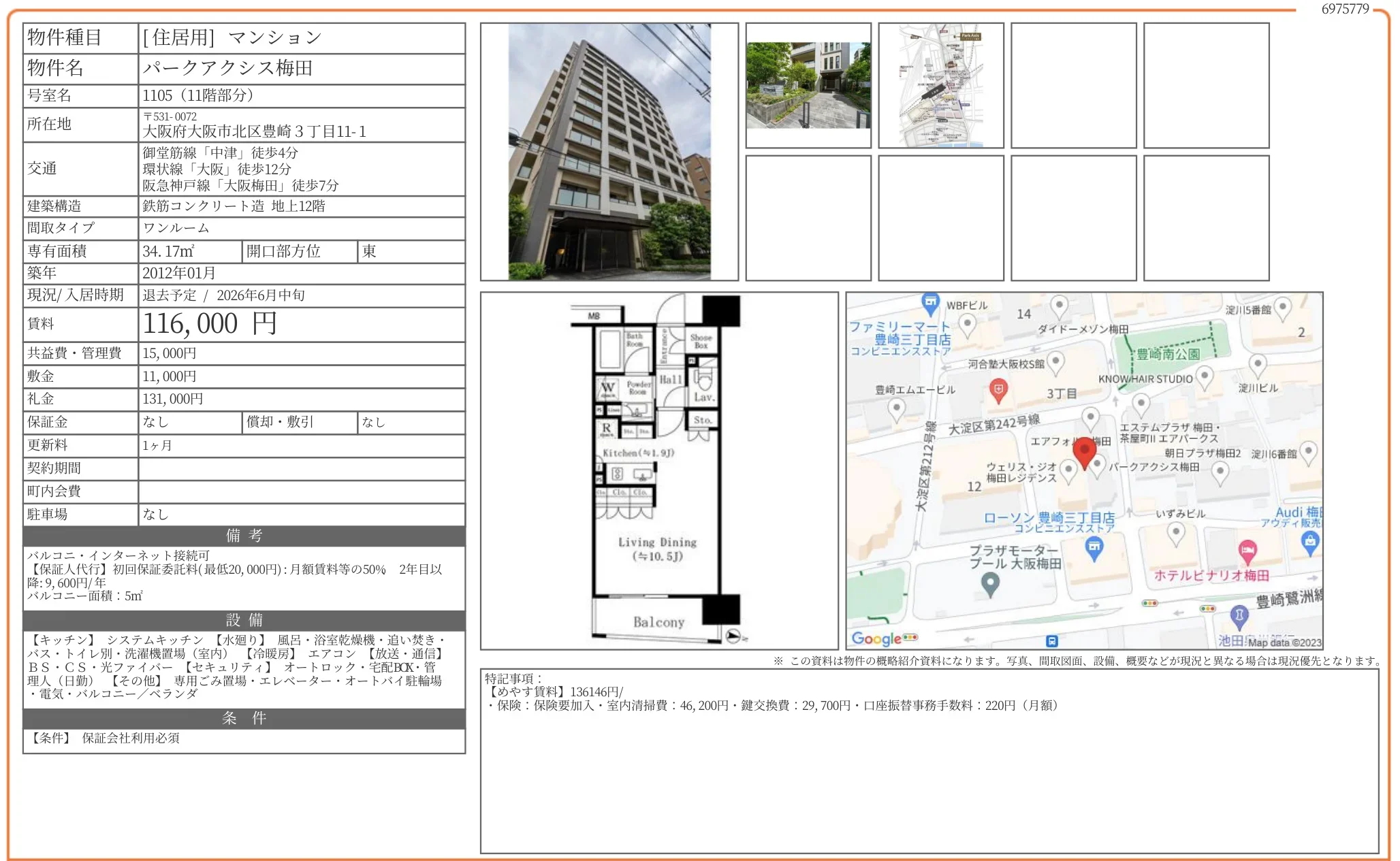 | 物件名 | パークアクシス梅田 1105 |