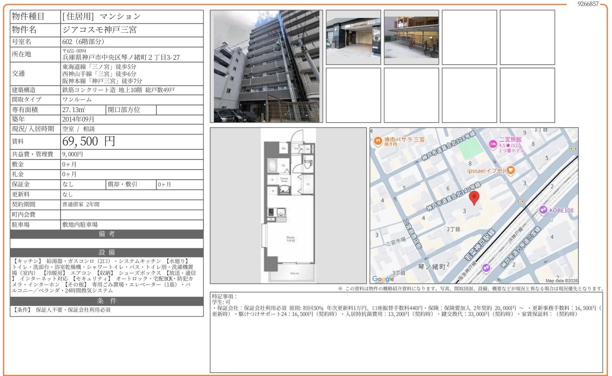 | 物件名 | ジアコスモ神戸三宮 602号 |