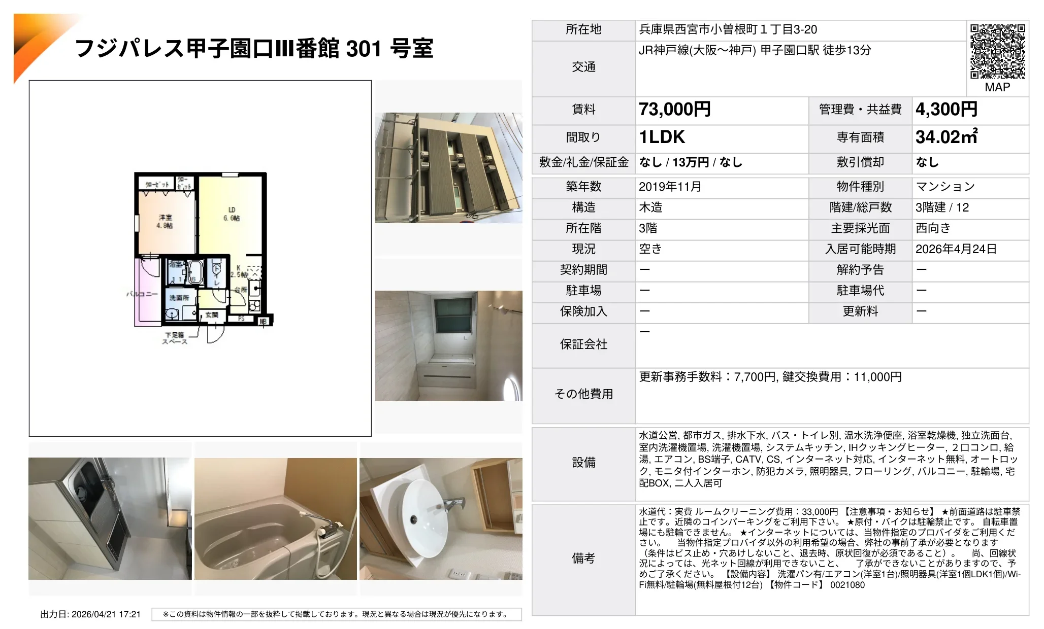 | 物件名 | フジパレス甲子園口番館 301号 |