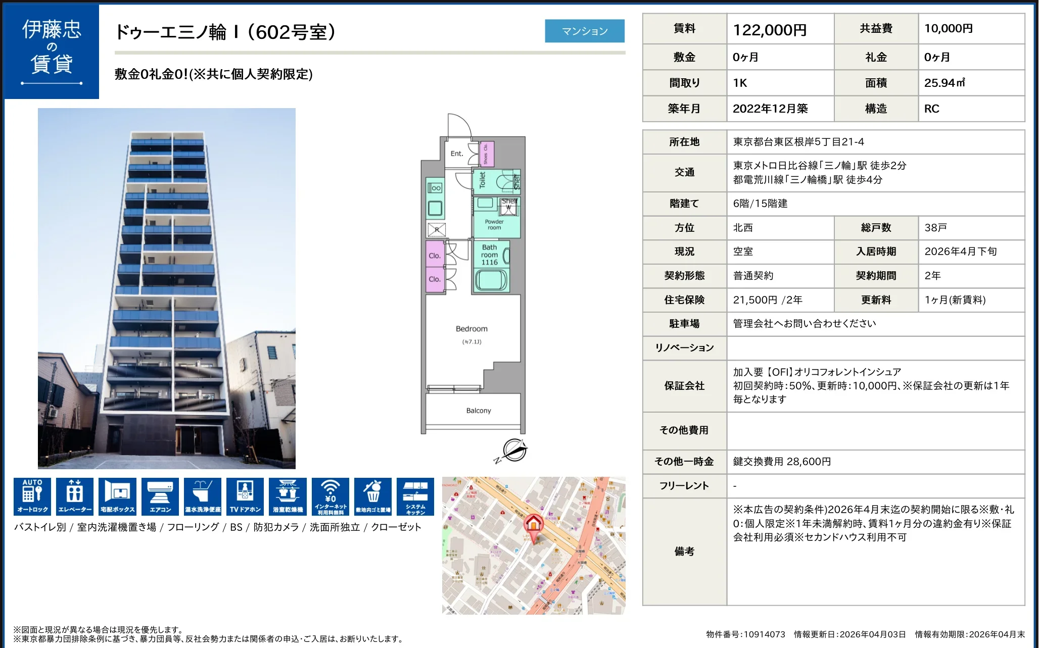 | 物件名 | ドゥーエ三ノ輪 602号 |