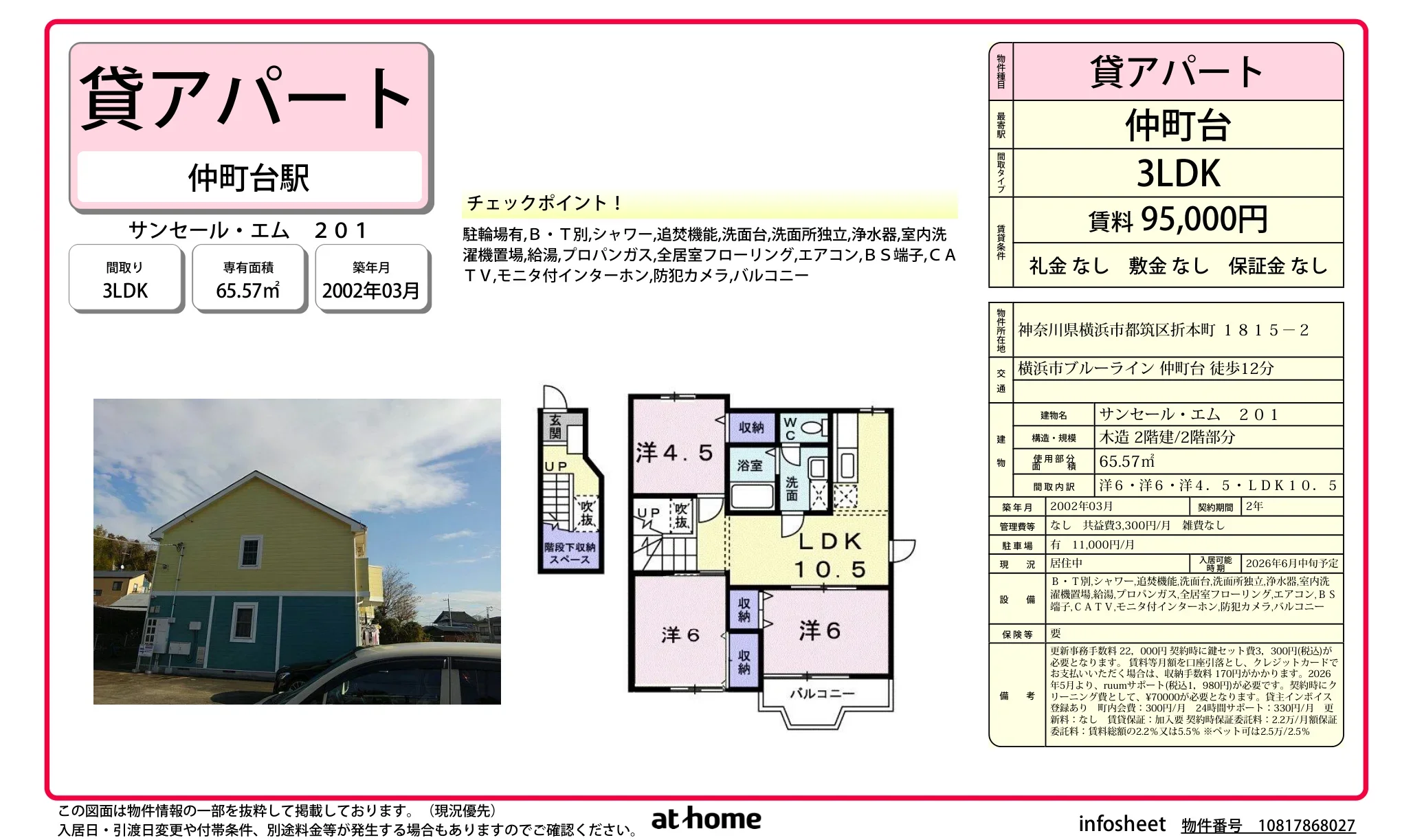 | 賃料 | 9.5万円 |