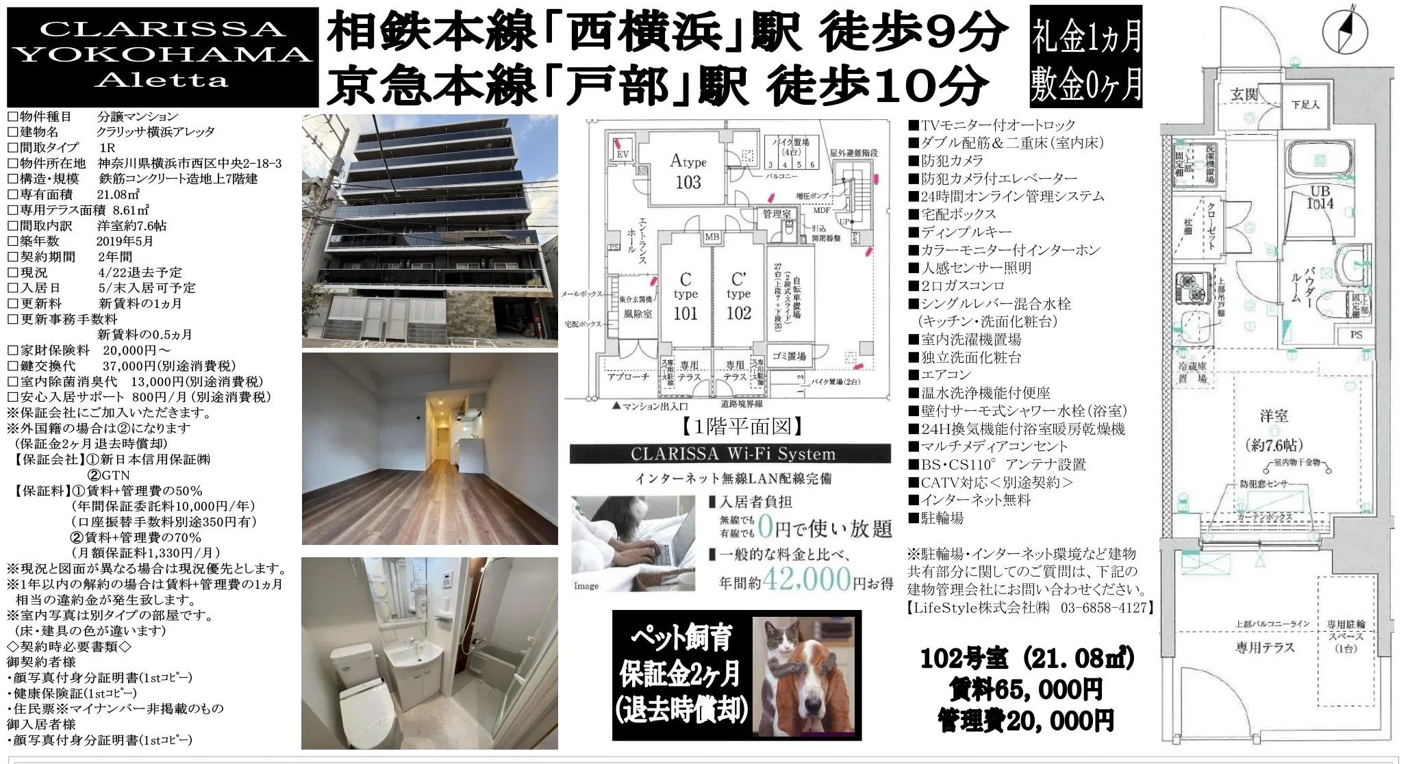 | 物件名 | クラリッサ横浜アレッタ 102号 |