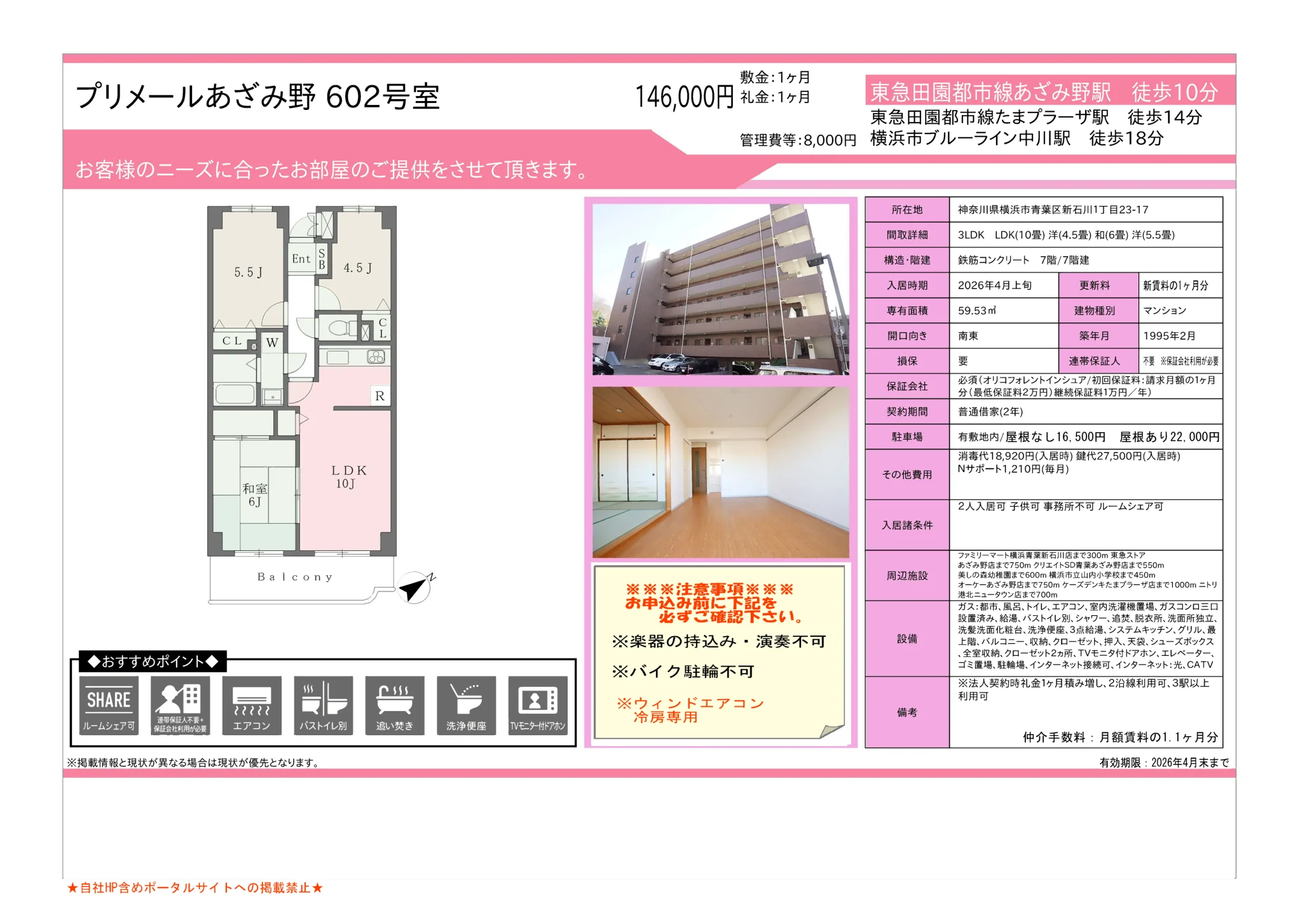 | 物件名 | プリメールあざみ野 602号室 602号 |