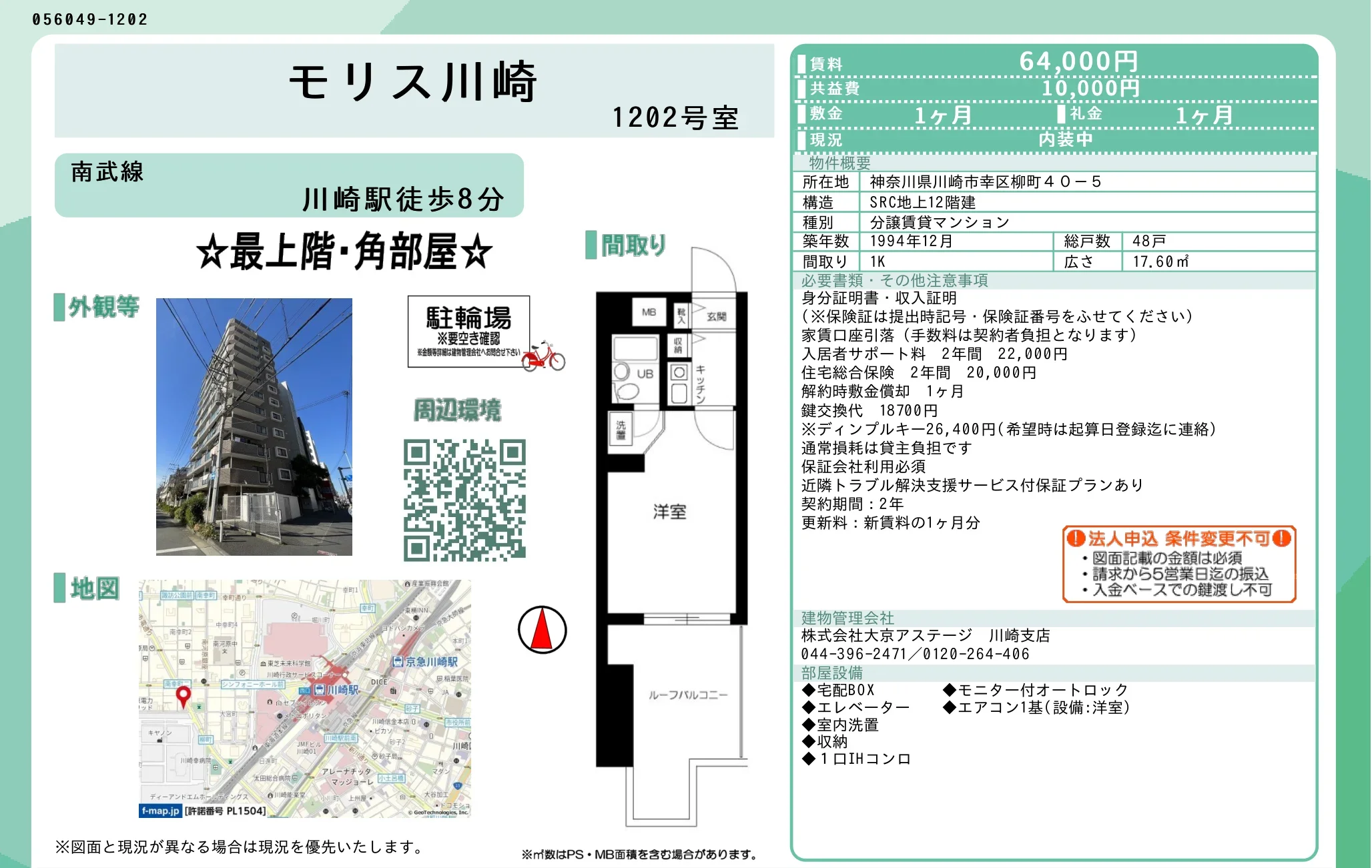 | 物件名 | モリス川崎 1202号 |