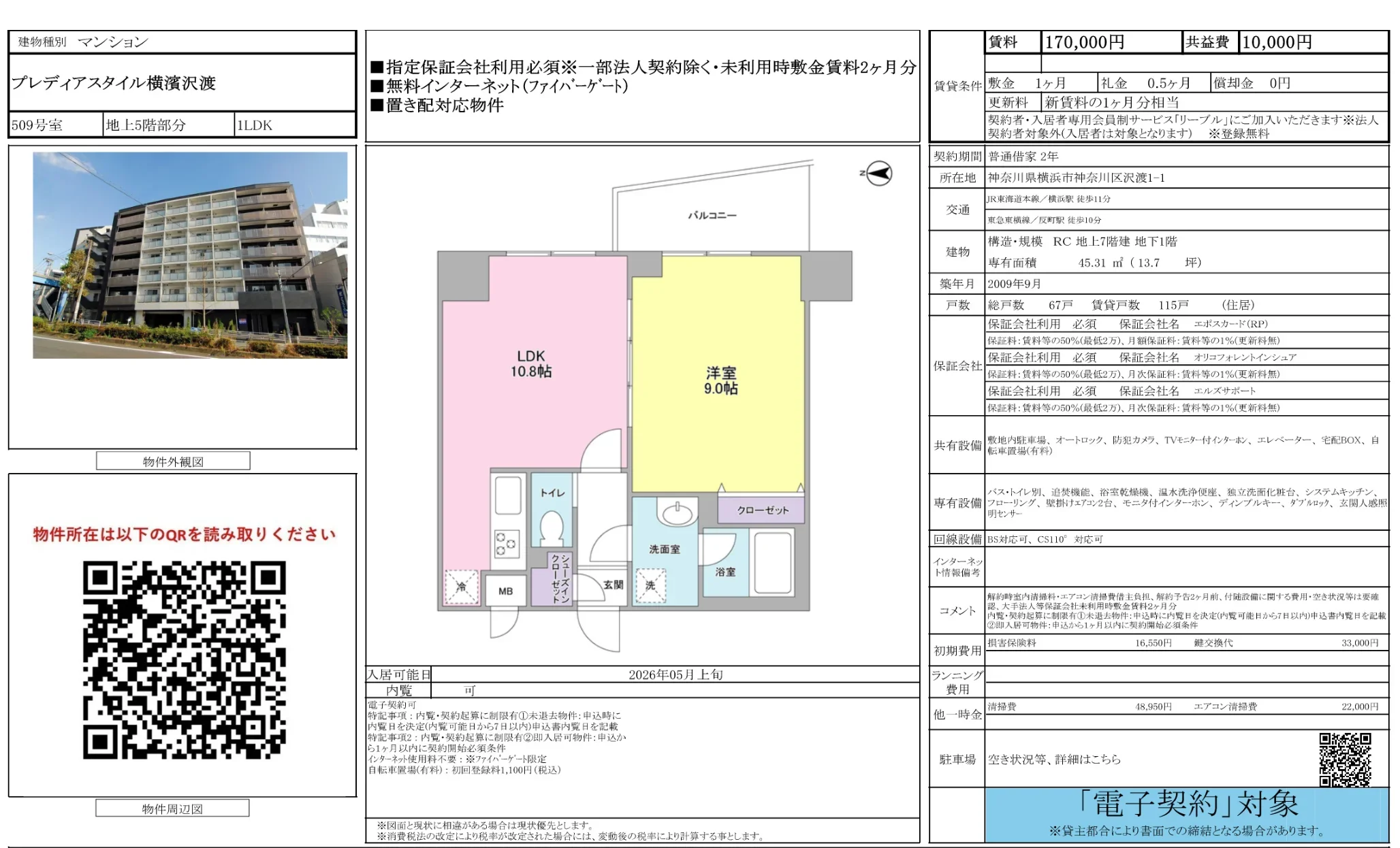 | 物件名 | プレディアスタイル横濱沢渡 509号 |