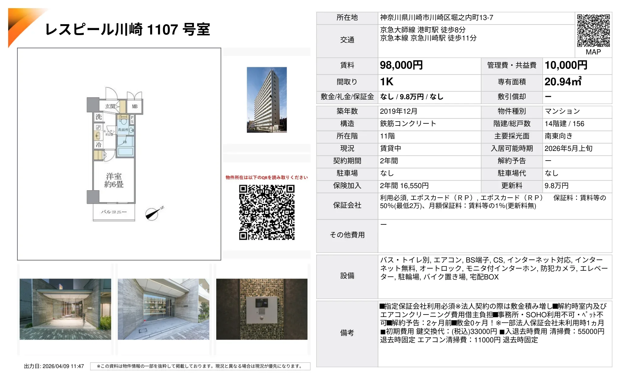 | 物件名 | レスピール川崎1107号室 1107号 |