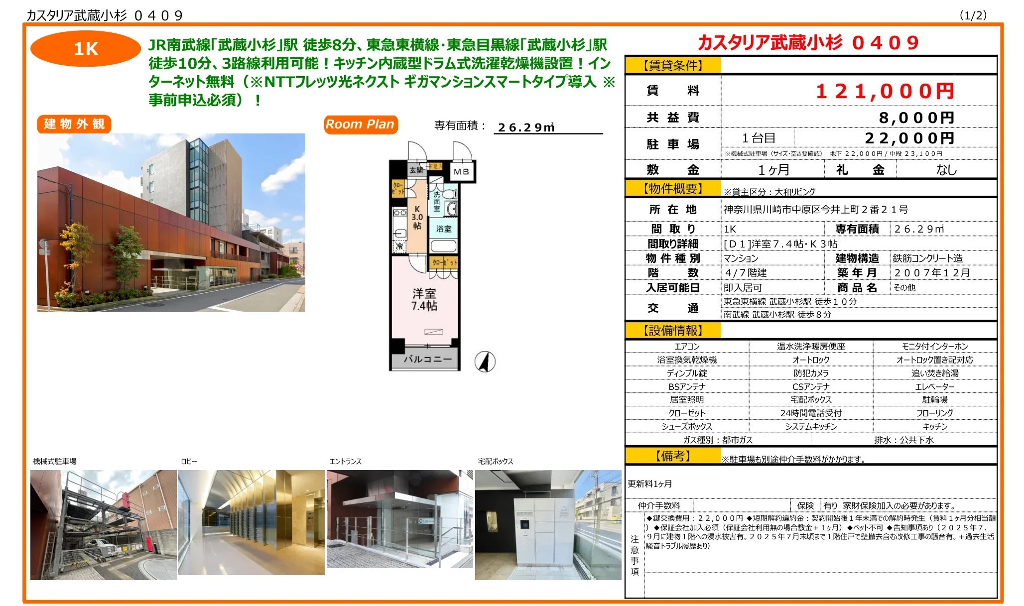 | 物件名 | カスタリア武蔵小杉 0409 1K |