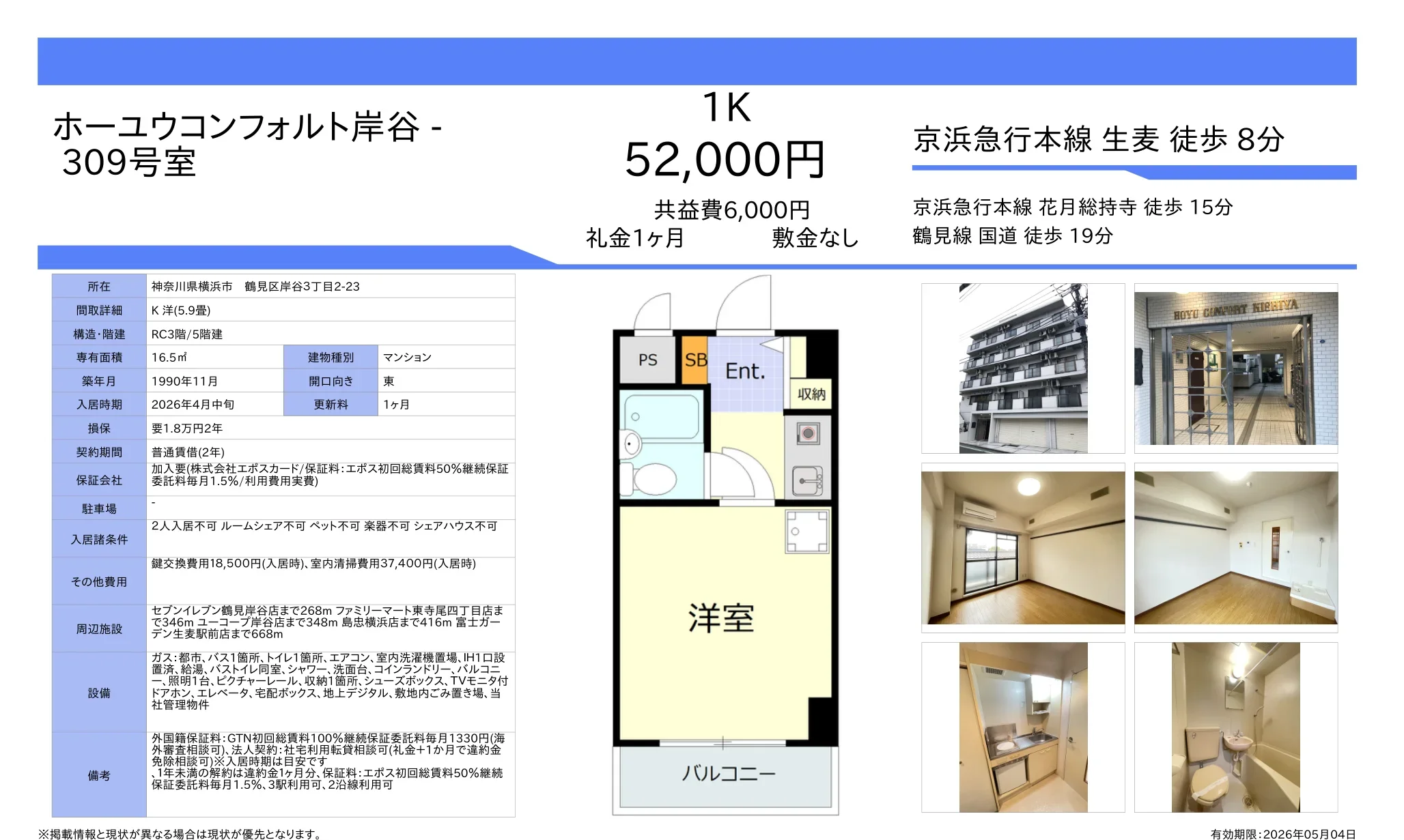| アクセス | 生麦 (徒歩8分) 花月総持寺 (徒歩15分) 国道 (徒歩19分) |