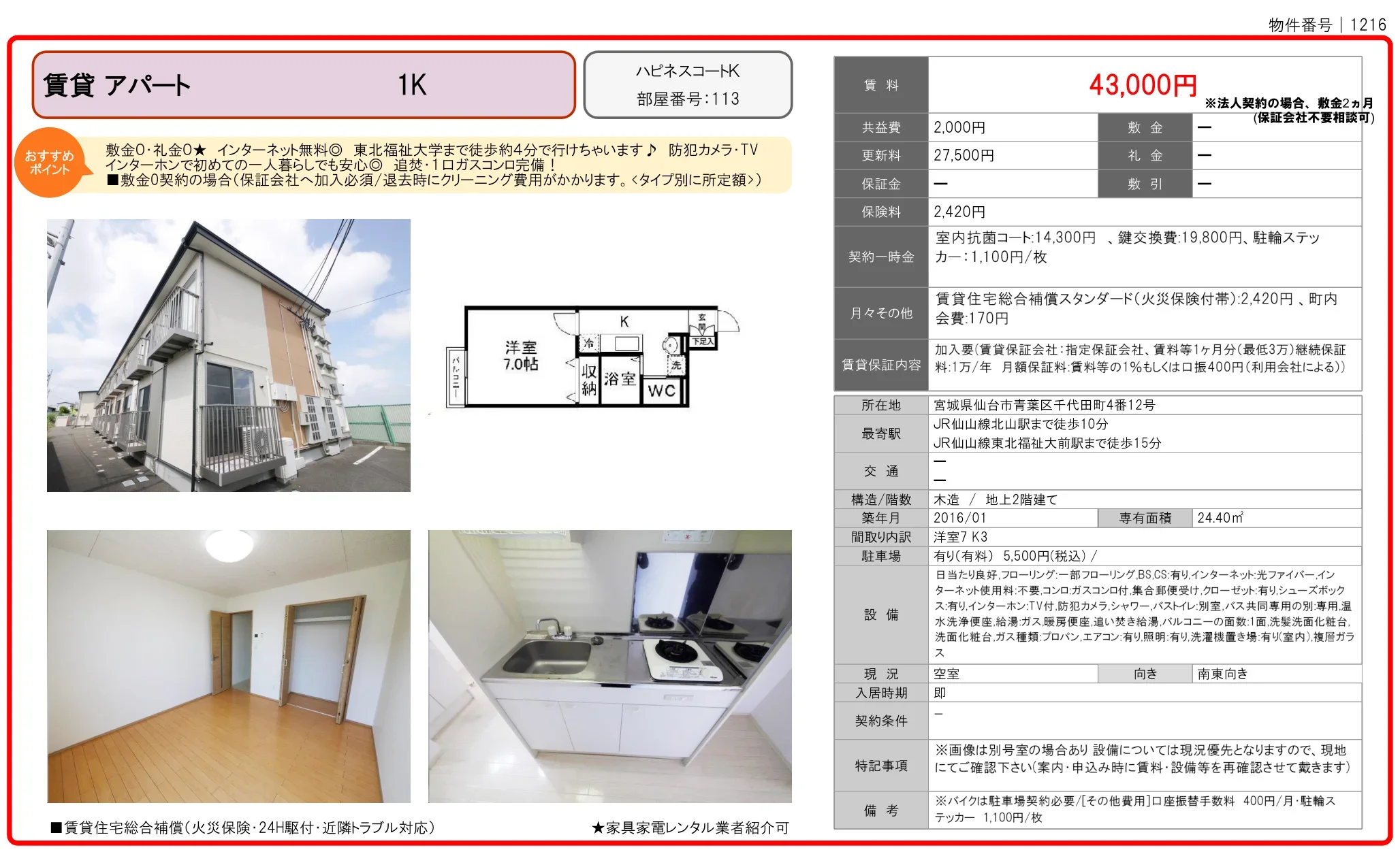 | 物件名 | ハピネスコートK 113 |