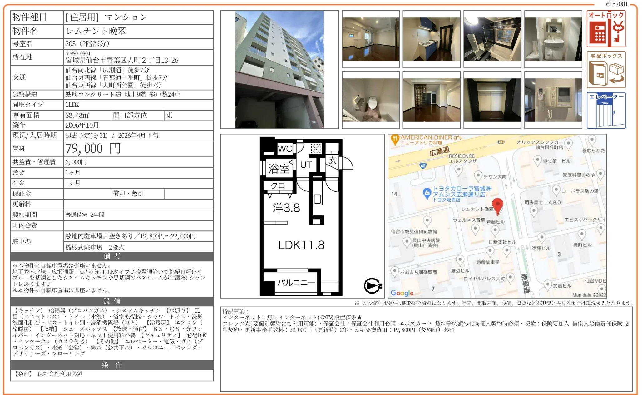 | アクセス | 広瀬通 (徒歩7分) 青葉通一番町 (徒歩7分) 大町西公園 (徒歩7分) |