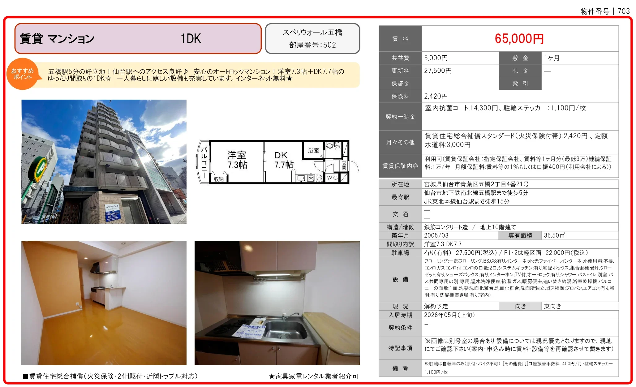 | アクセス | 五橋駅 (徒歩5分) 仙台駅 (徒歩15分) |