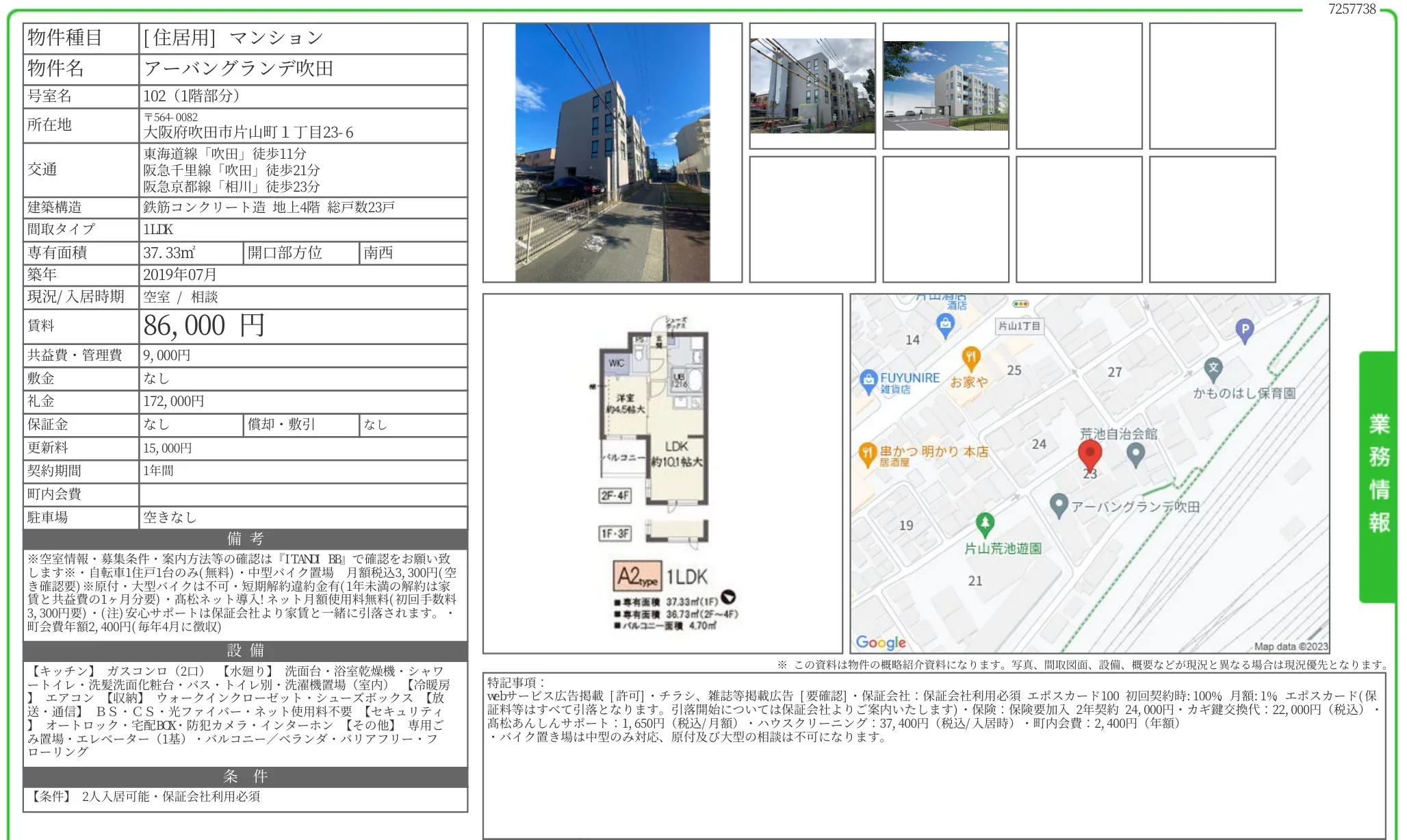 | アクセス | 吹田 (徒歩11分) 吹田 (徒歩21分) 相川 (徒歩23分) |