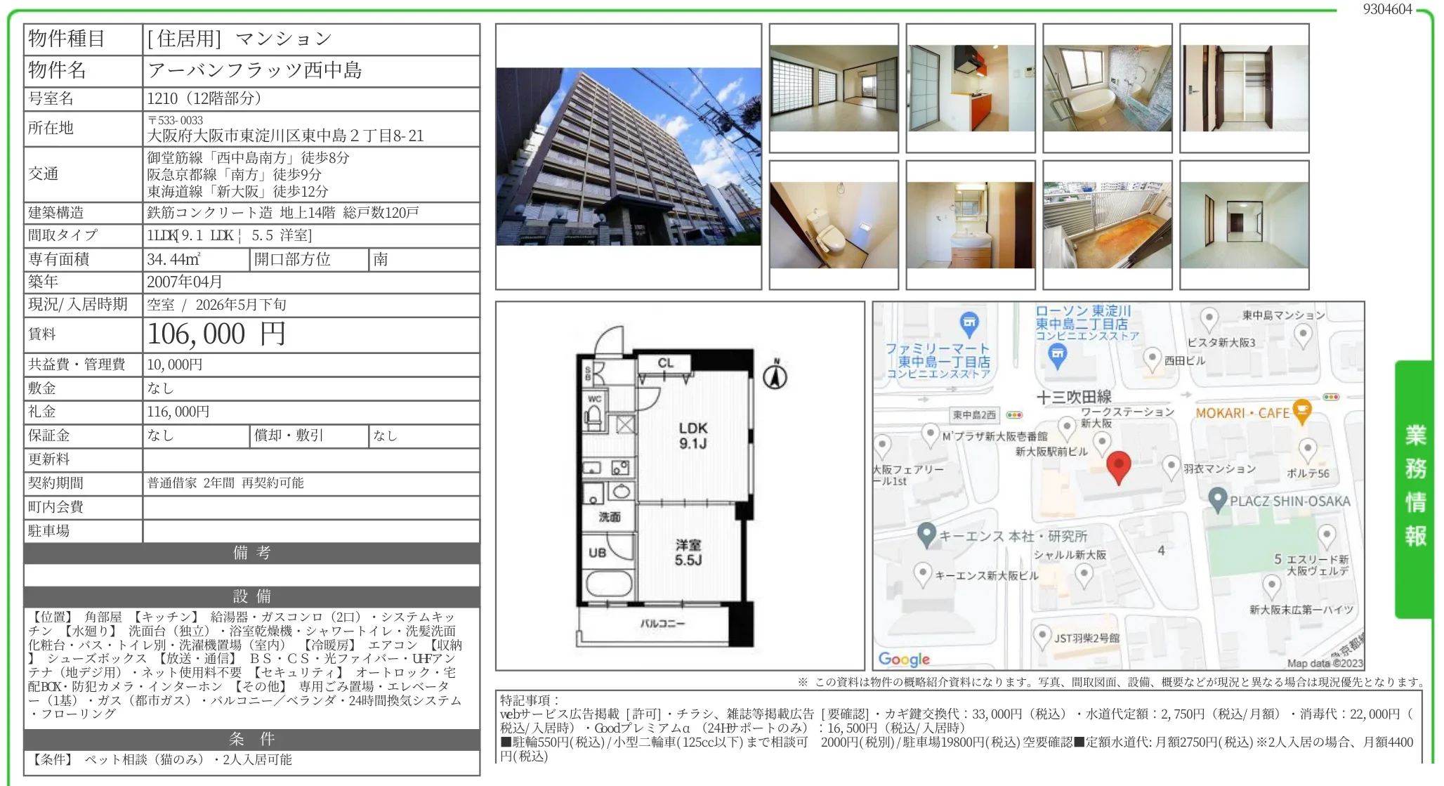 | アクセス | 西中島南方 (徒歩8分) 南方 (徒歩9分) 新大阪 (徒歩12分) |