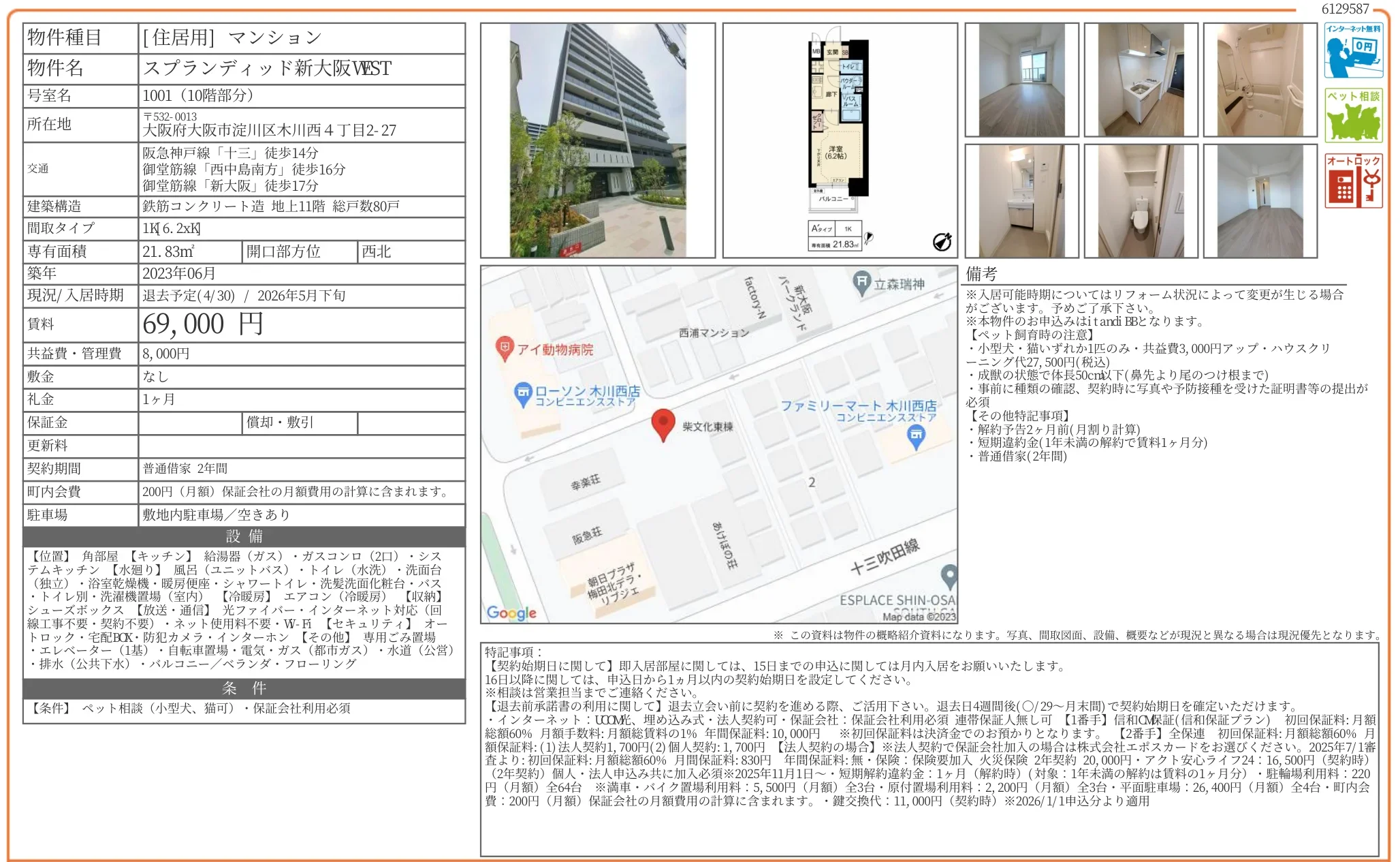 | 物件名 | スプランディッド新大阪VEST 1001 |