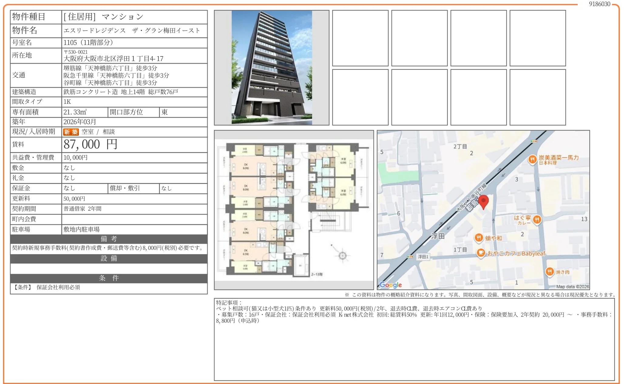 | 物件名 | エスリードレジデンス ザ・グラン梅田イースト 1105号 |