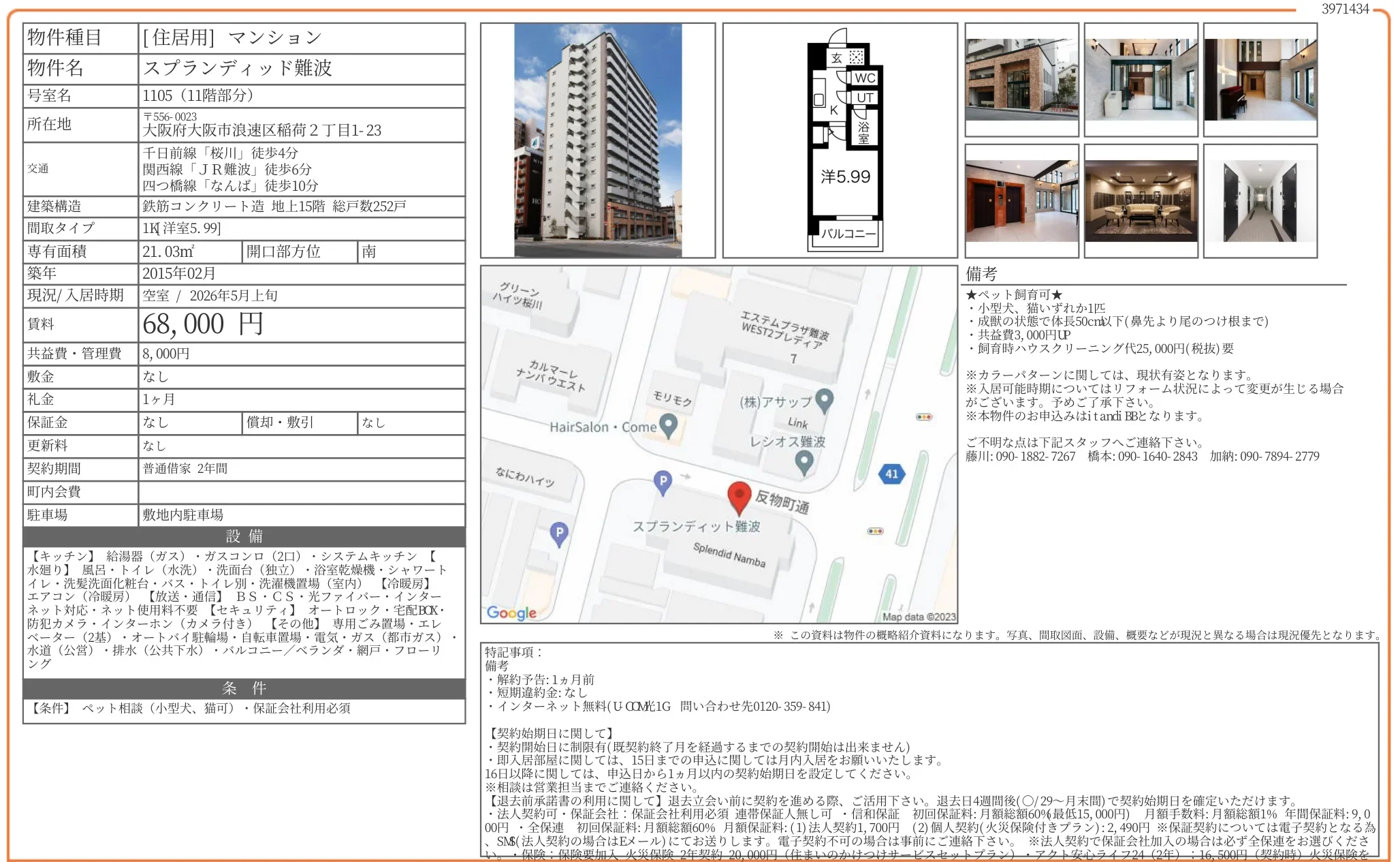 | 物件名 | スプランディッド難波 1105号 |