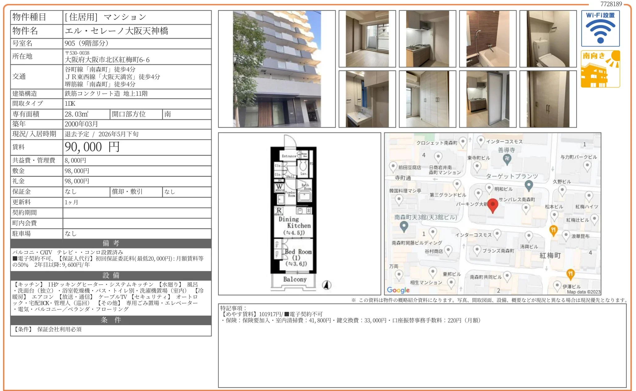 | 物件名 | エル・セレーノ大阪天神橋 905号 |