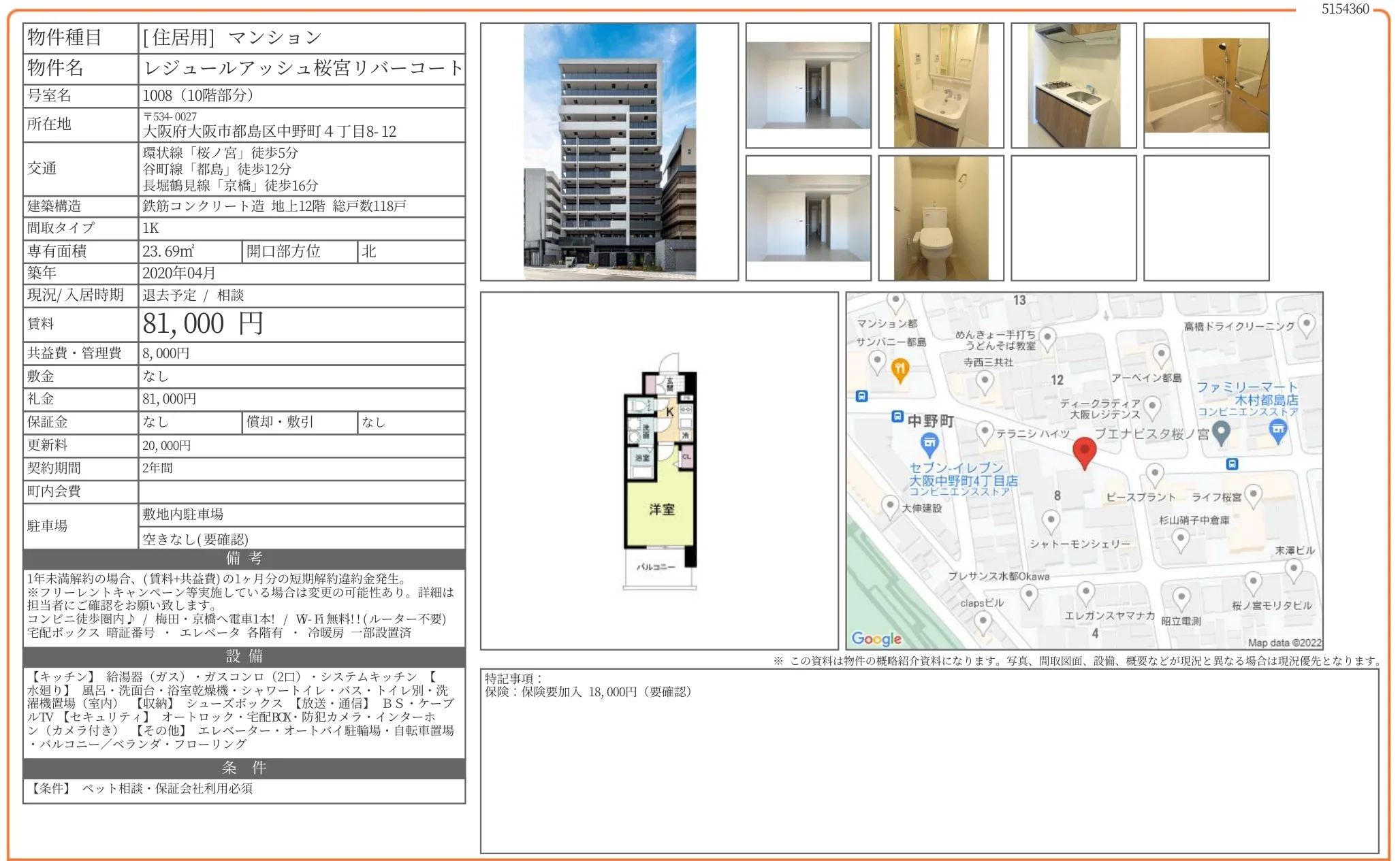 | 物件名 | レジュールアッシュ桜宮リバーコート 1008 |