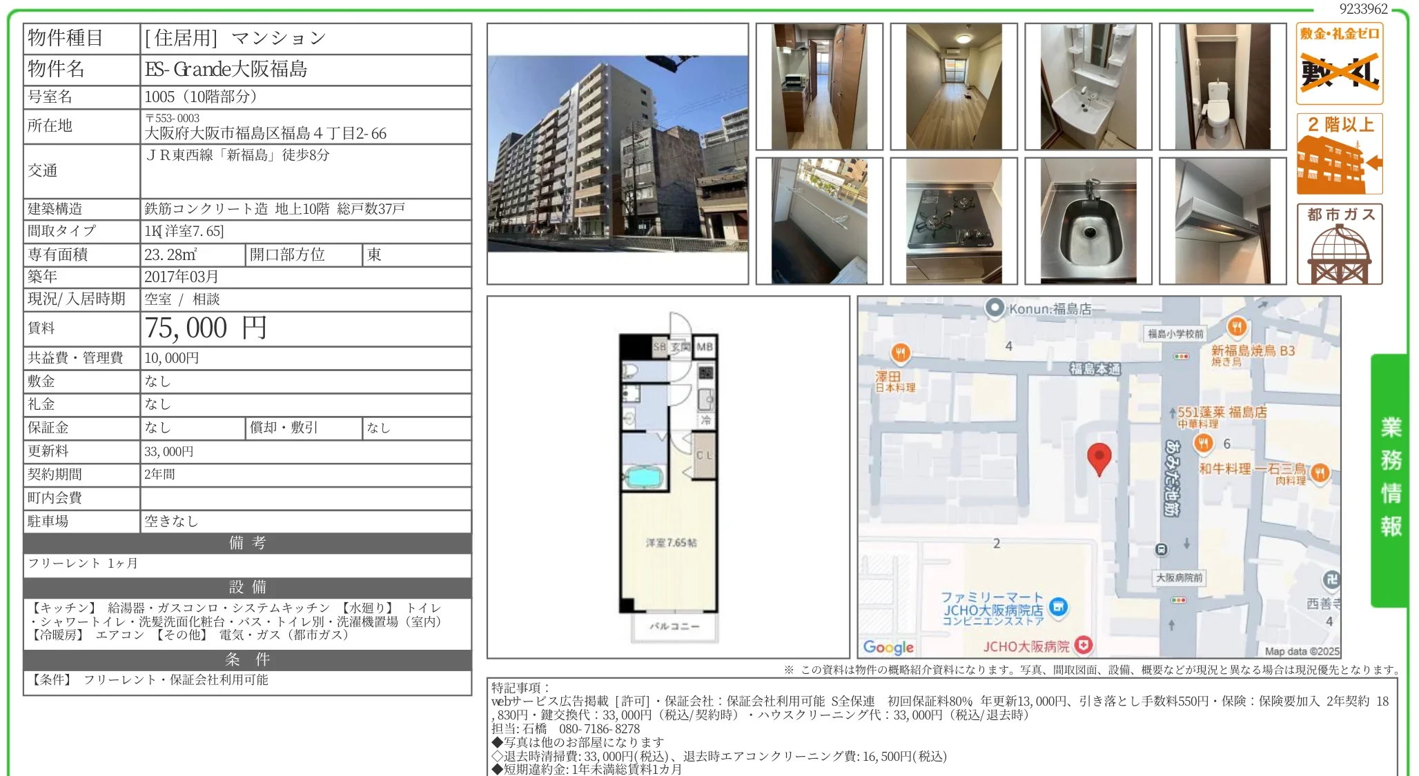 | 物件名 | ES- Grande 大阪福島 1005 |