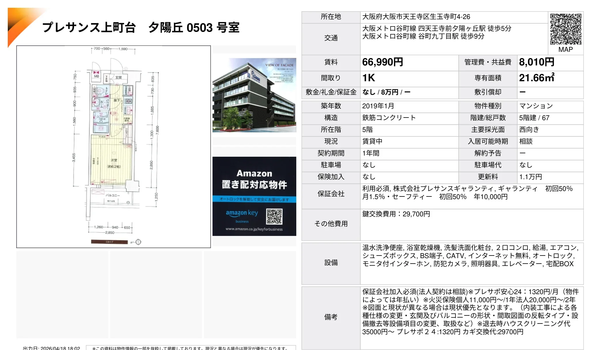 | 物件名 | プレサンス上町台 夕陽丘 0503号室 0503号 |