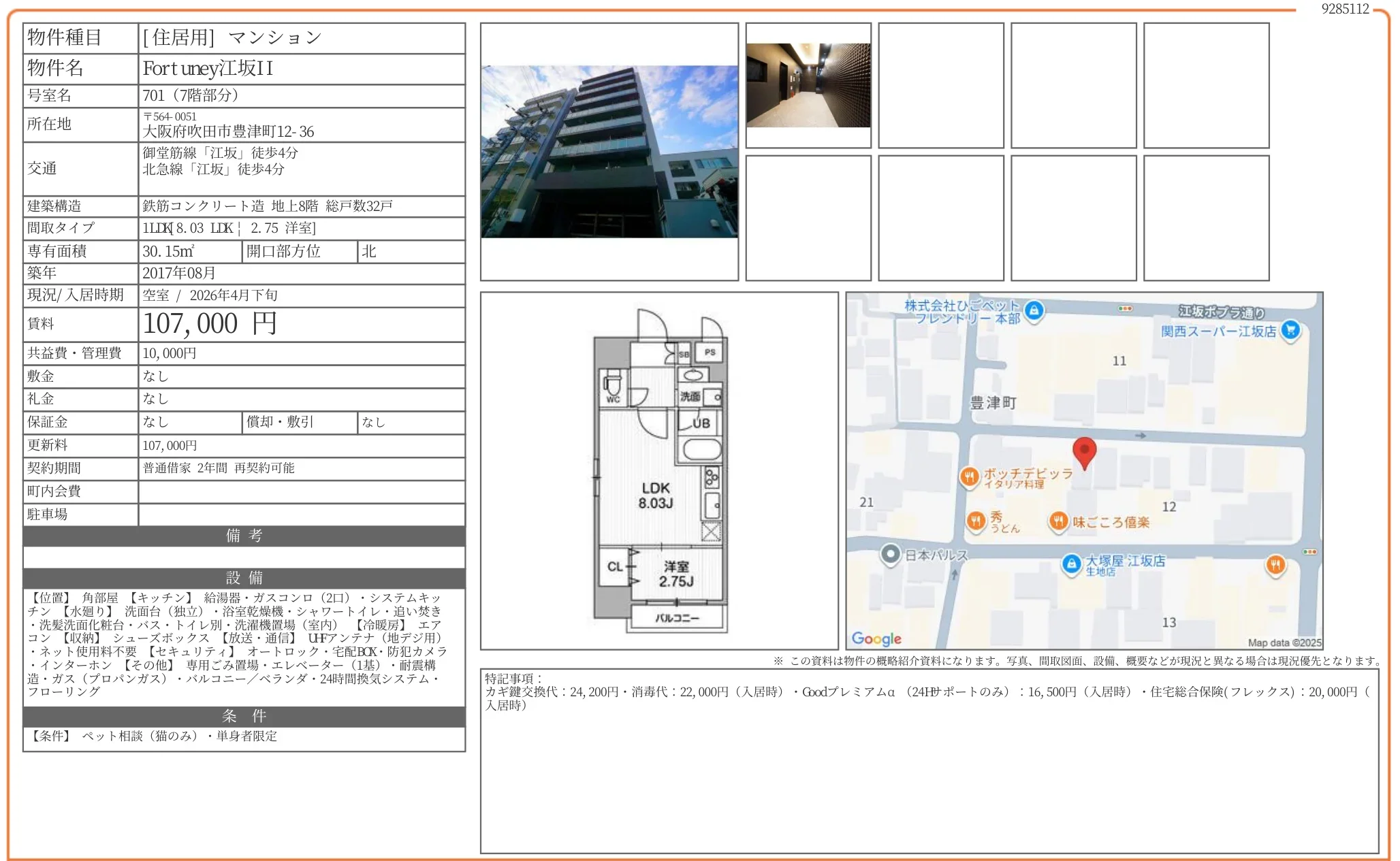 | 物件名 | Fortuney江坂 701号 |