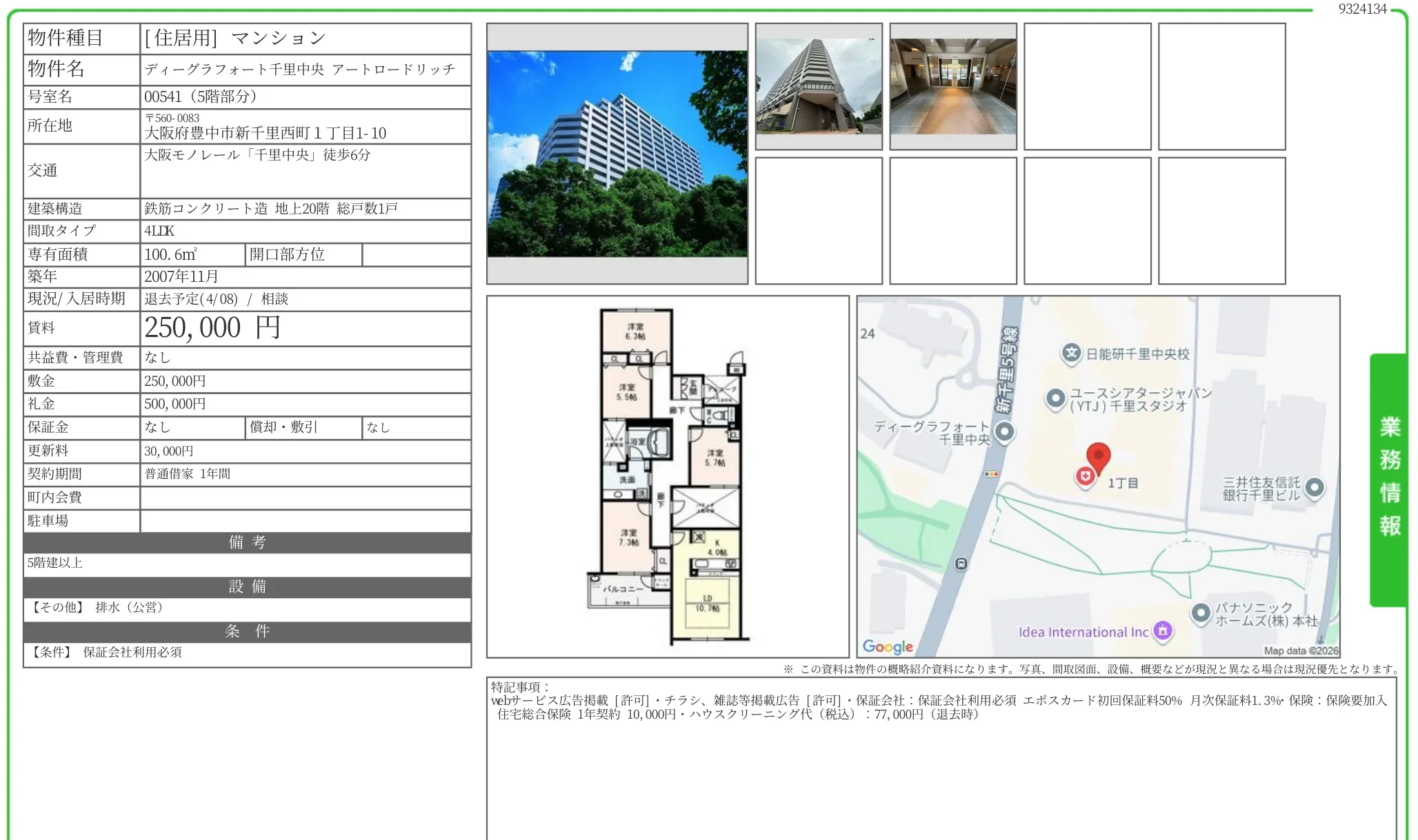 | 物件名 | ディーグラフォート千里中央 アートロードリッチ 541号 |