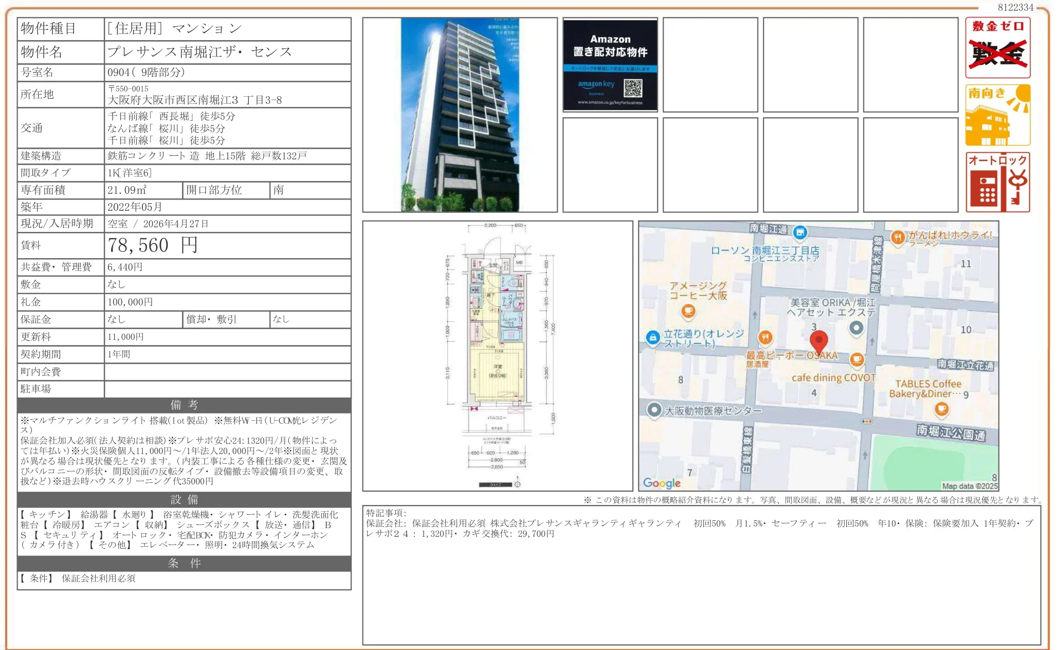 | 物件名 | プレサンス南堀江ザ・センス 0904 |