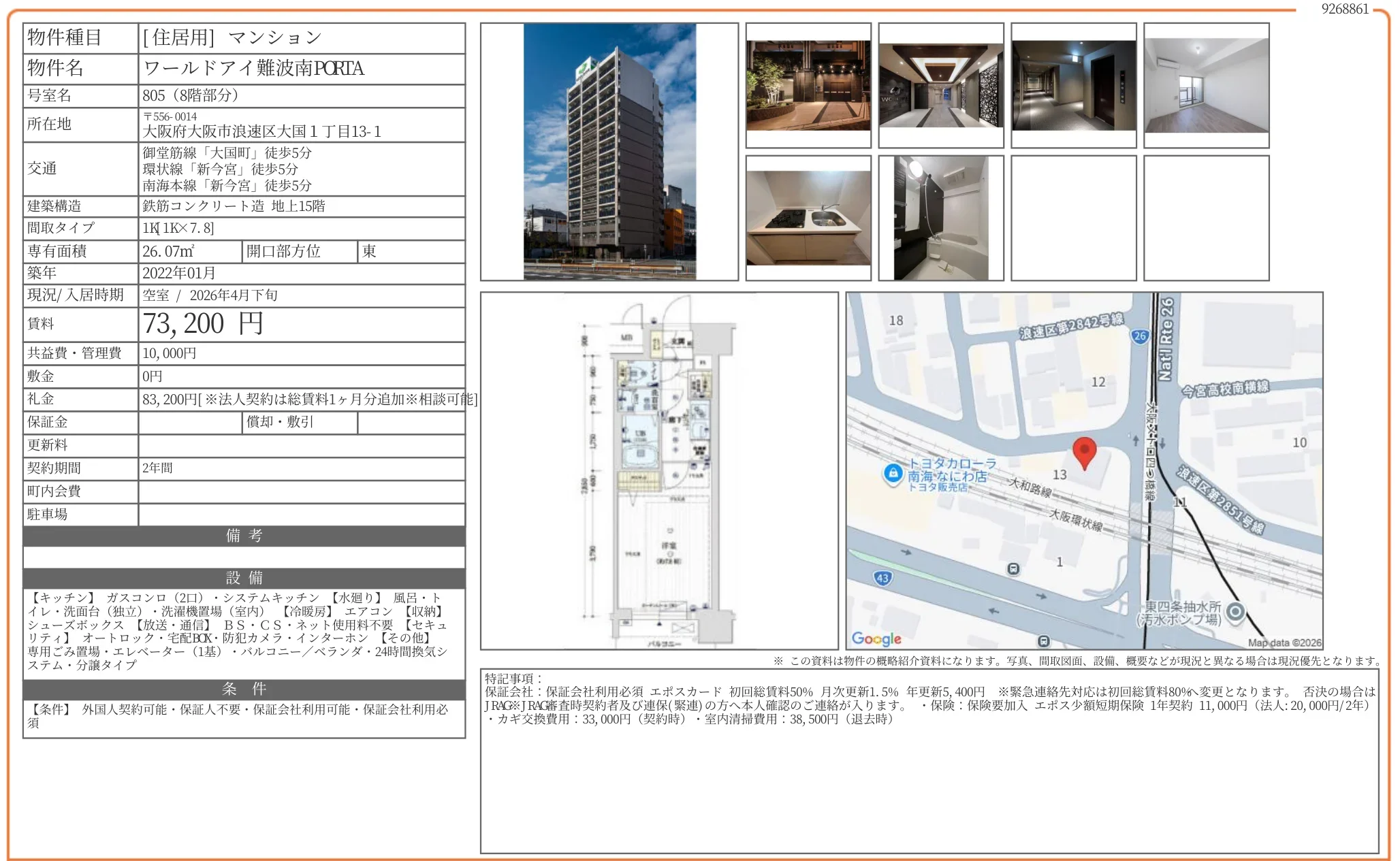 | 物件名 | ワールドアイ難波南PORTA 805 |