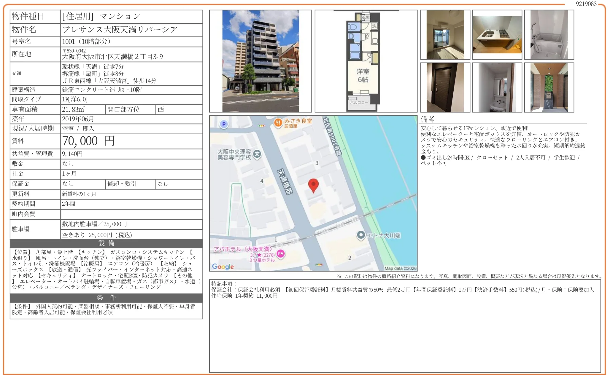 | 物件名 | プレサンス大阪天満リバーシア 1001号 |