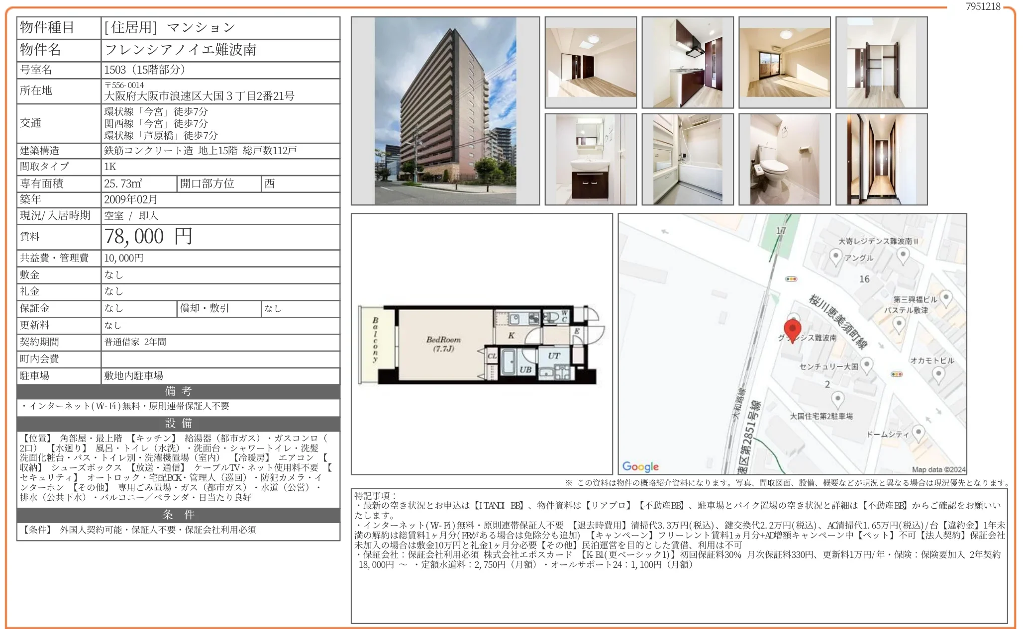 | 物件名 | フレンシアノイエ難波南 1503 |