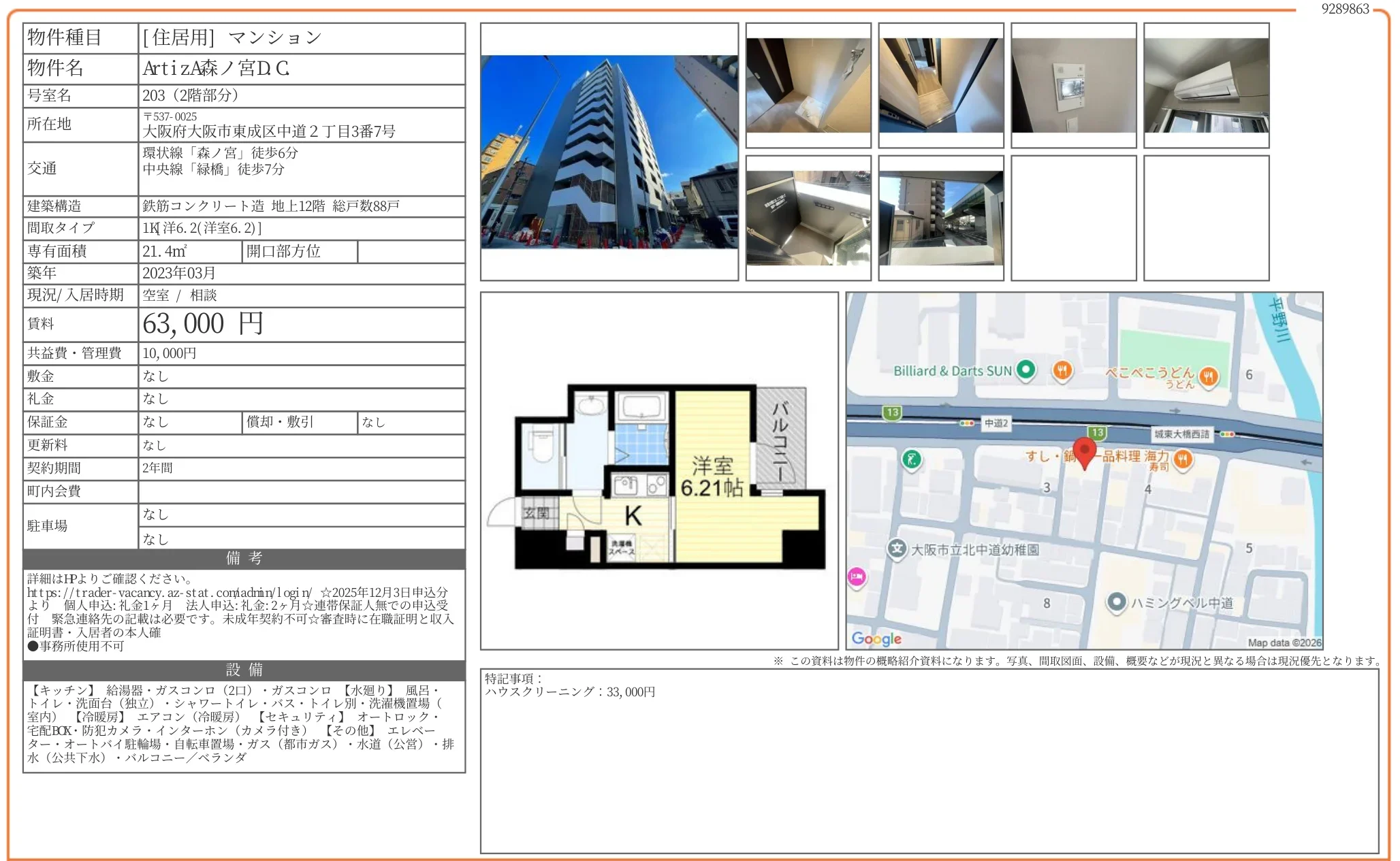 | 賃料 | 6.3万円 |