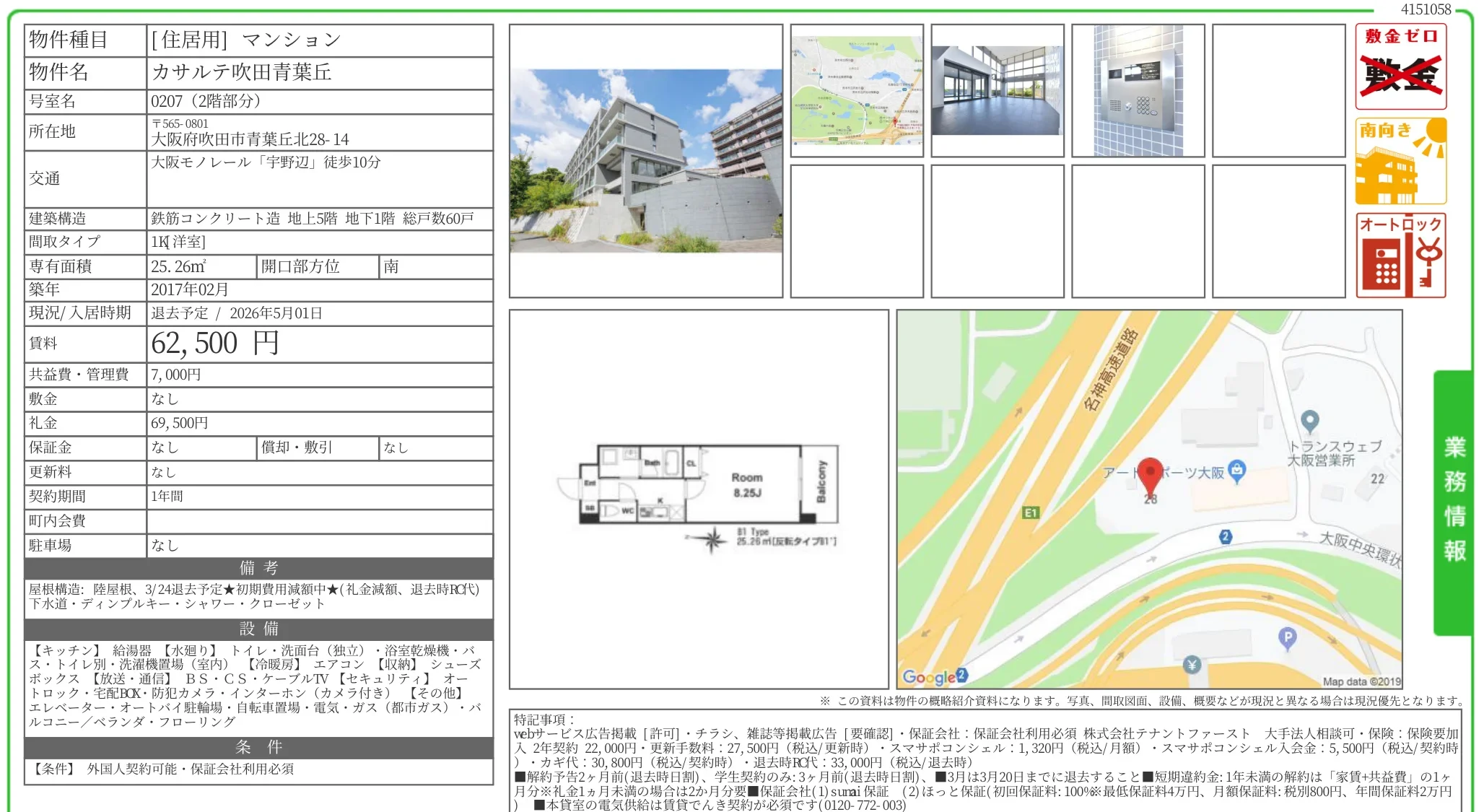 | 物件名 | カサルテ吹田青葉丘 0207 |