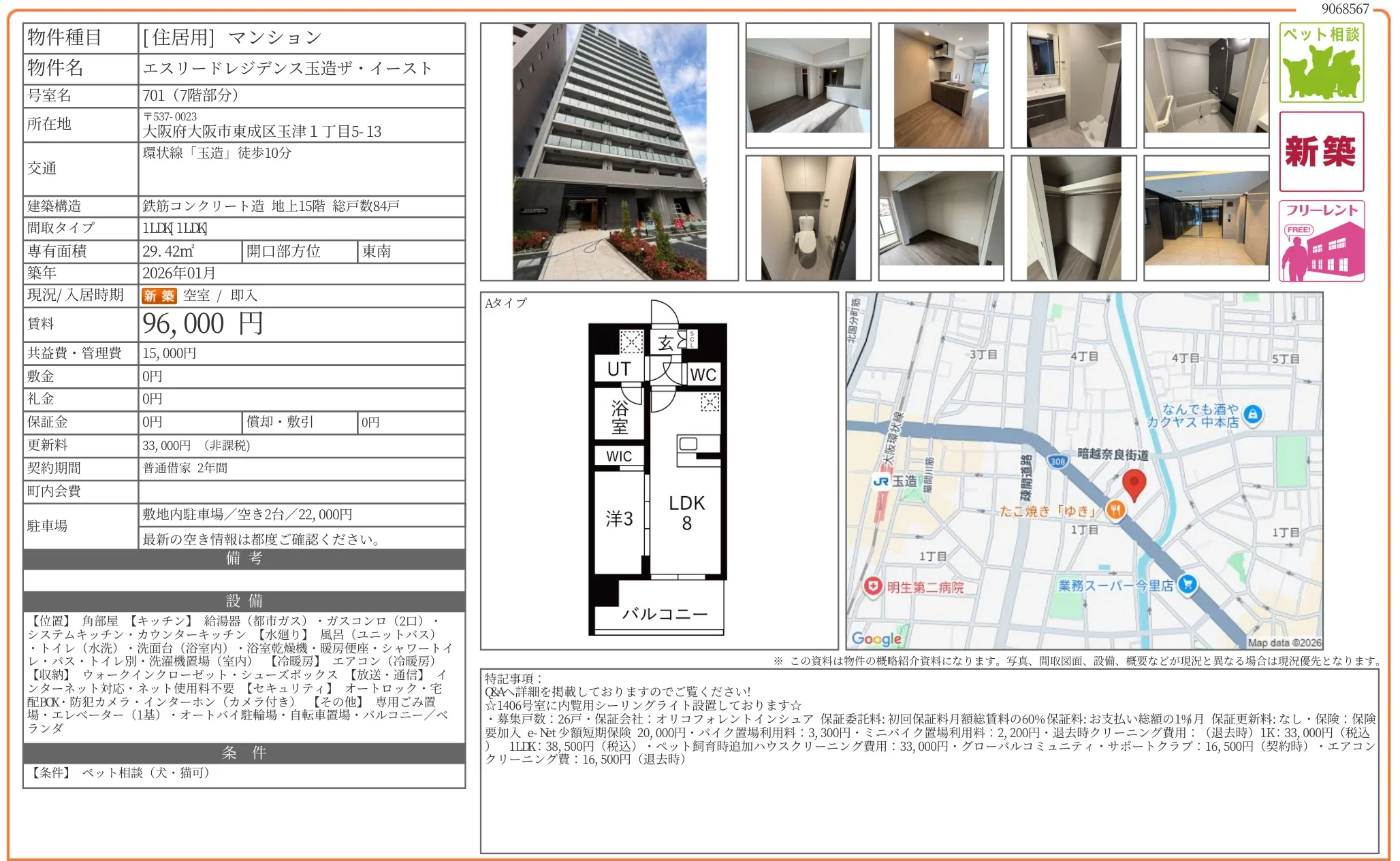 | 物件名 | エスリードレジデンス玉造ザイースト 701号 |