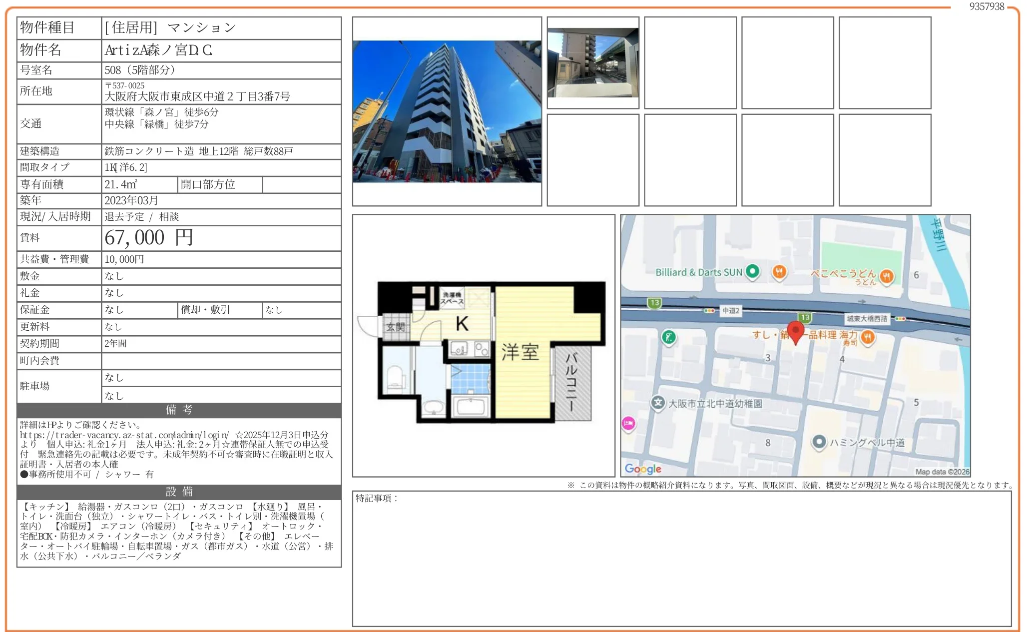 | 物件名 | アーティズA森ノ宮DC 508号 |