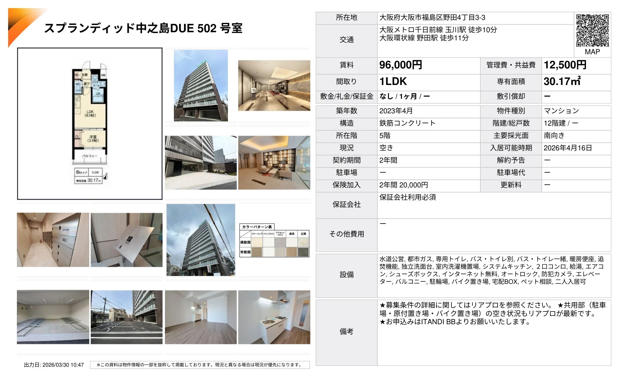 | 建物名 | スプランディッド中之島DUE 502号室 |
