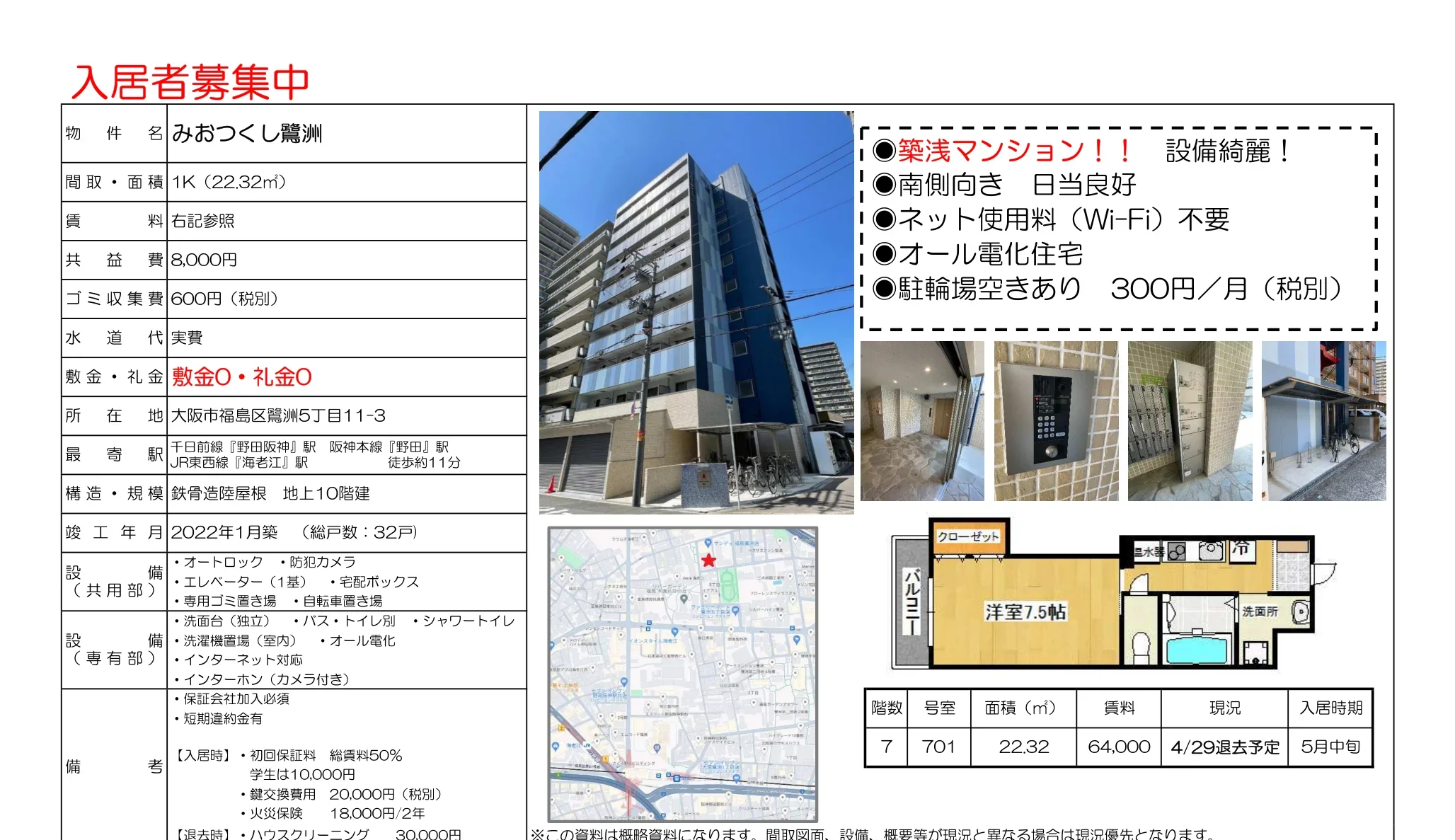 | アクセス | 野田阪神 (徒歩11分) 野田 (徒歩11分) 海老江 (徒歩11分) |