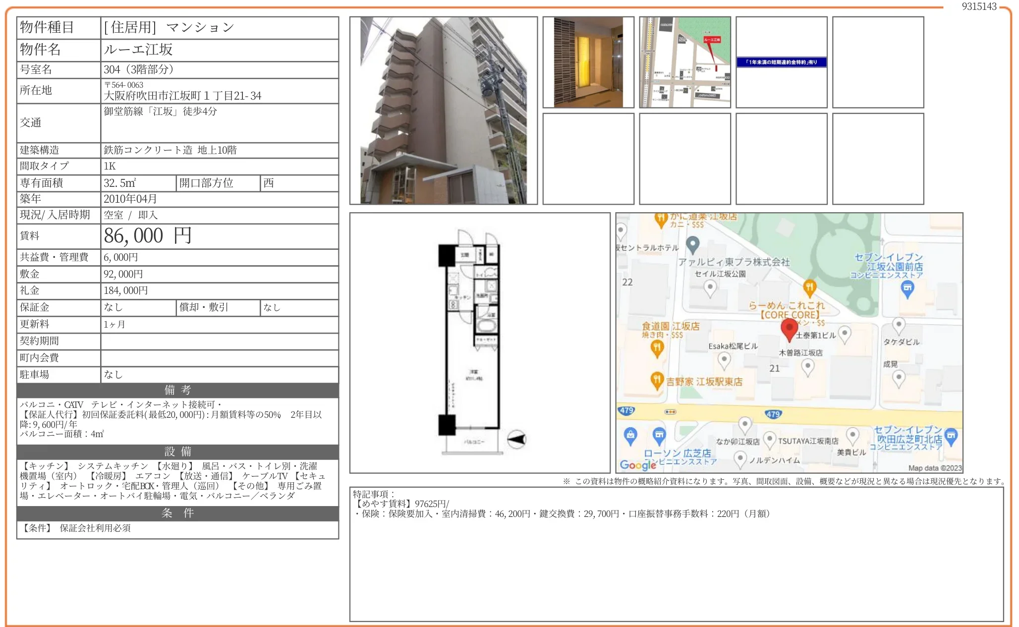 | 物件名 | ルーエ江坂 304号 |