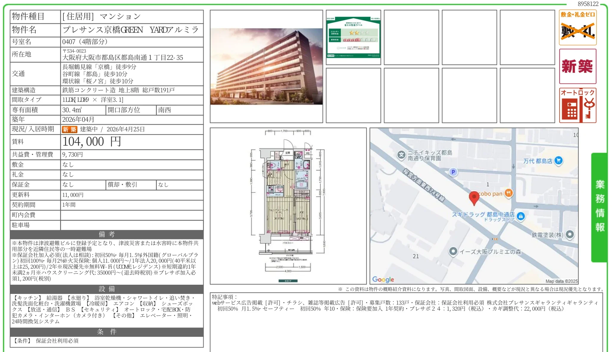 | 建物名 | プレサンス京橋 GREEN YARDアルミラ |