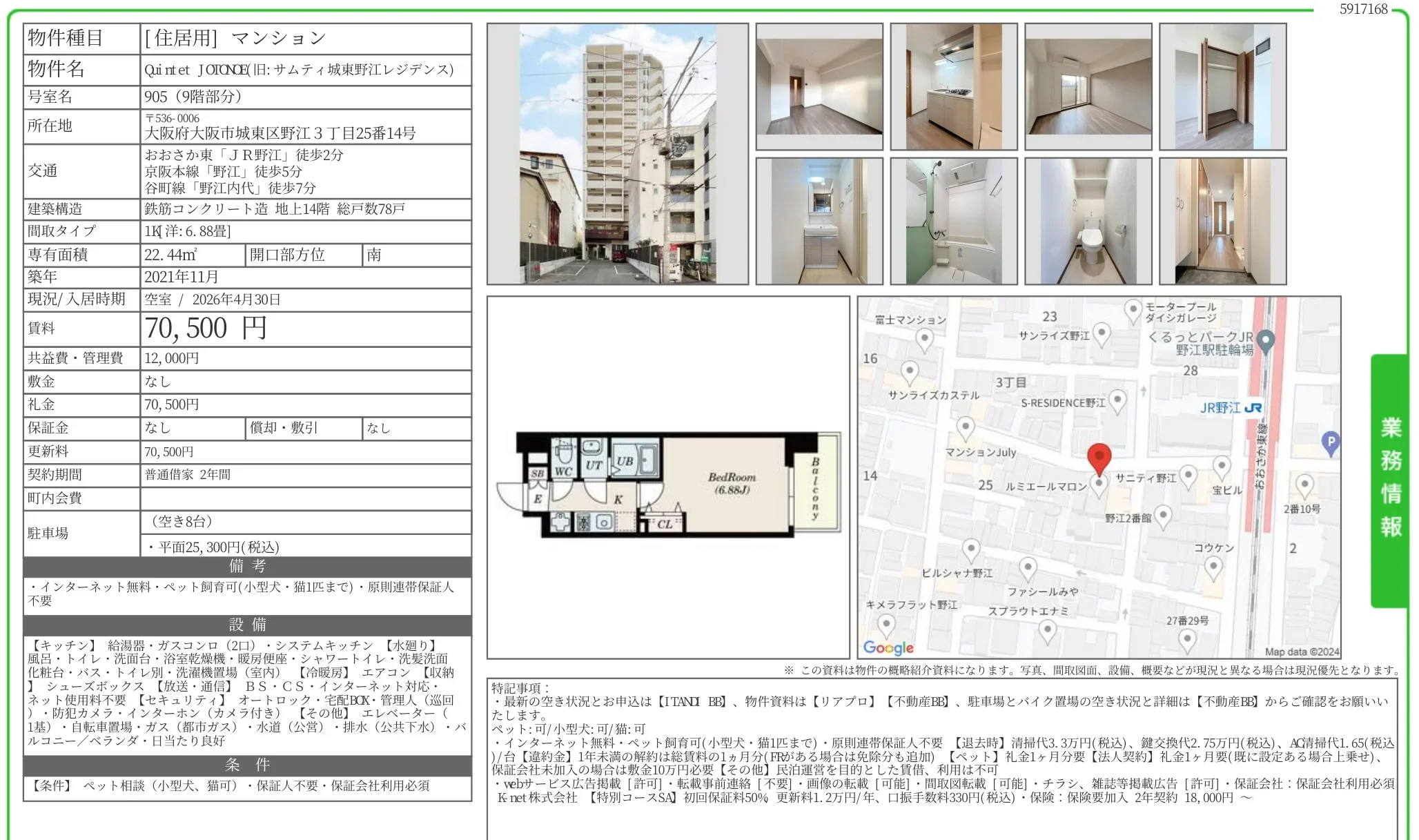 | 物件名 | Quintet JOTONE(旧: サムティ城東野江レジデンス) 905 |